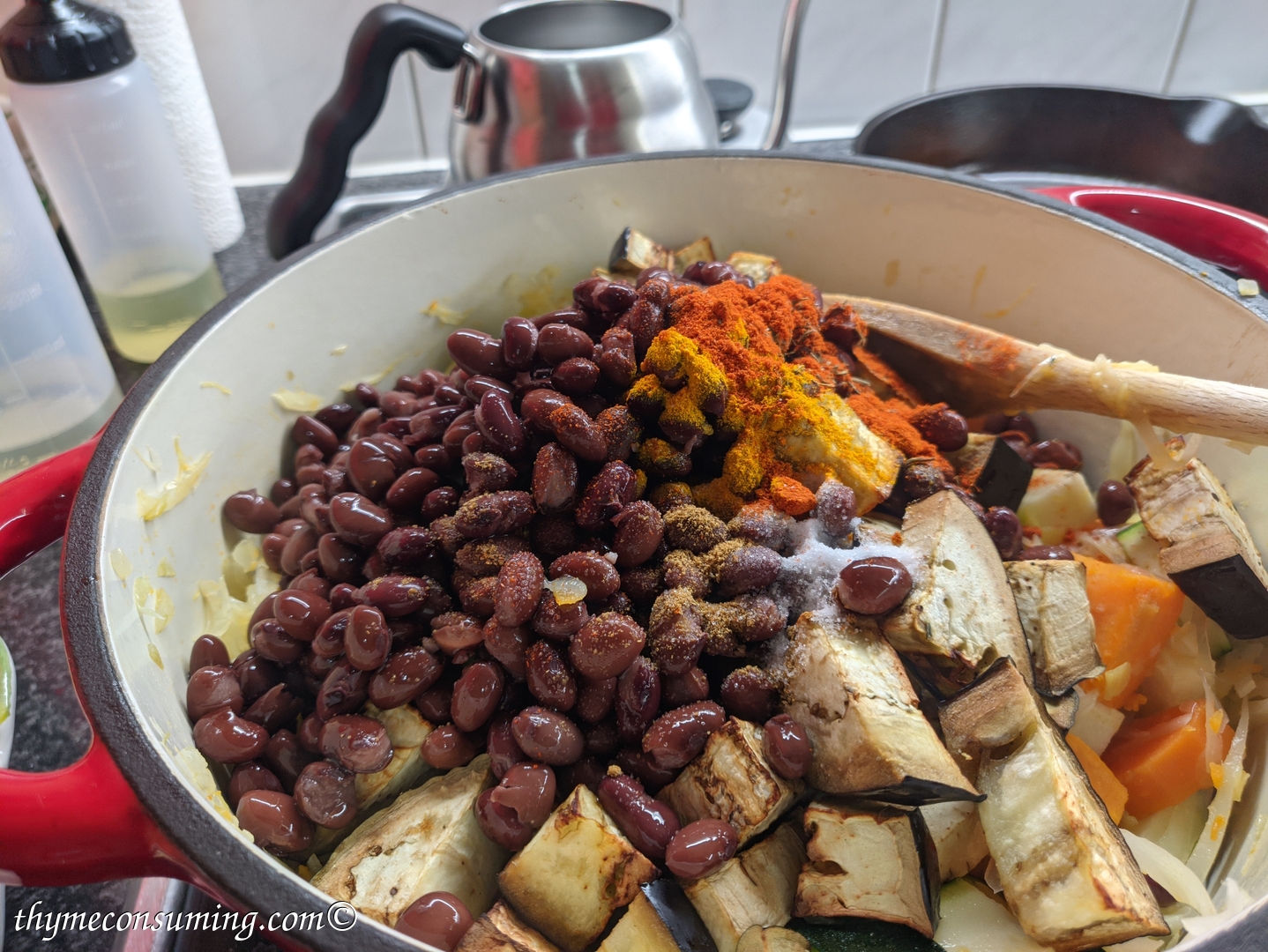 - Immediately add the beans, tomatoes and spices: 1 teaspoon of paprika, 1 teaspoon of salt, 1/4 teaspoon of powder cumin, 1/5 teaspoon of thyme.