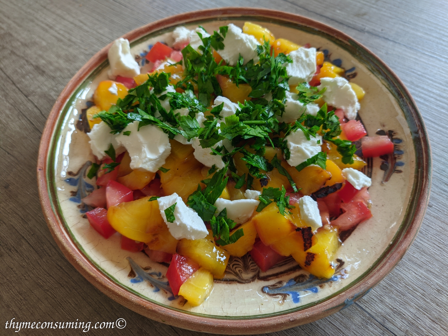 - Add the tomatoes with the cubed peaches to a bowl, add some soft goat cheese, freshly chopped parsley or basil and the vinaigrette.