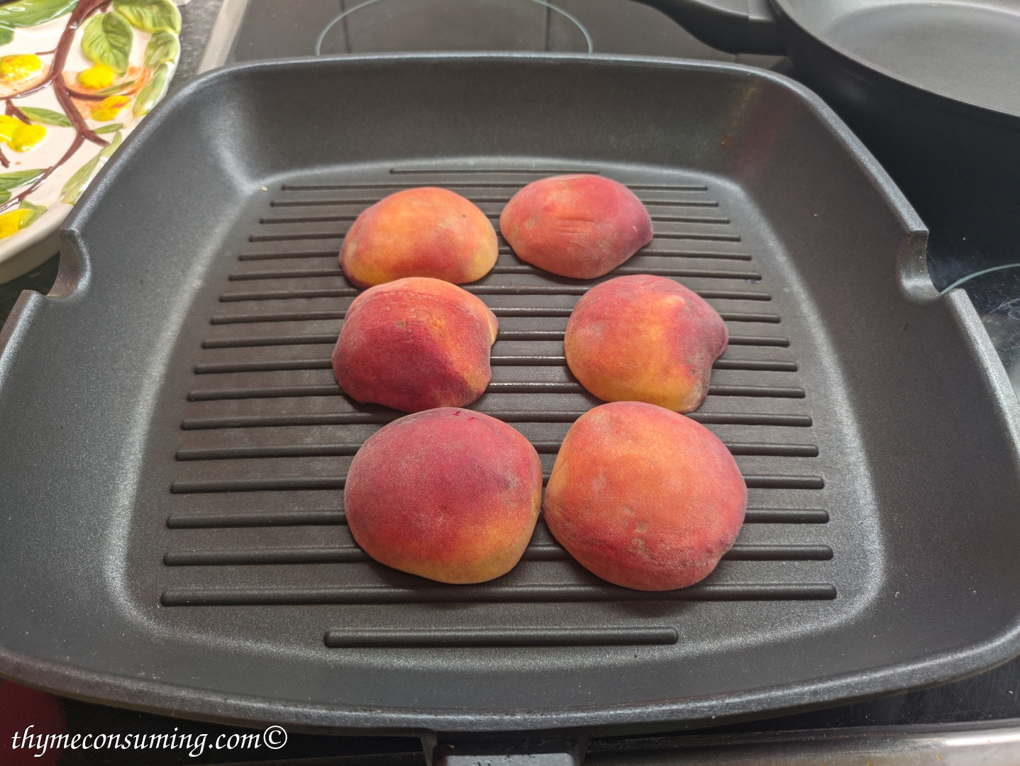 - Grill two peaches first with the inside down. Of course, get the pit out. Then grill them on the skinny part.