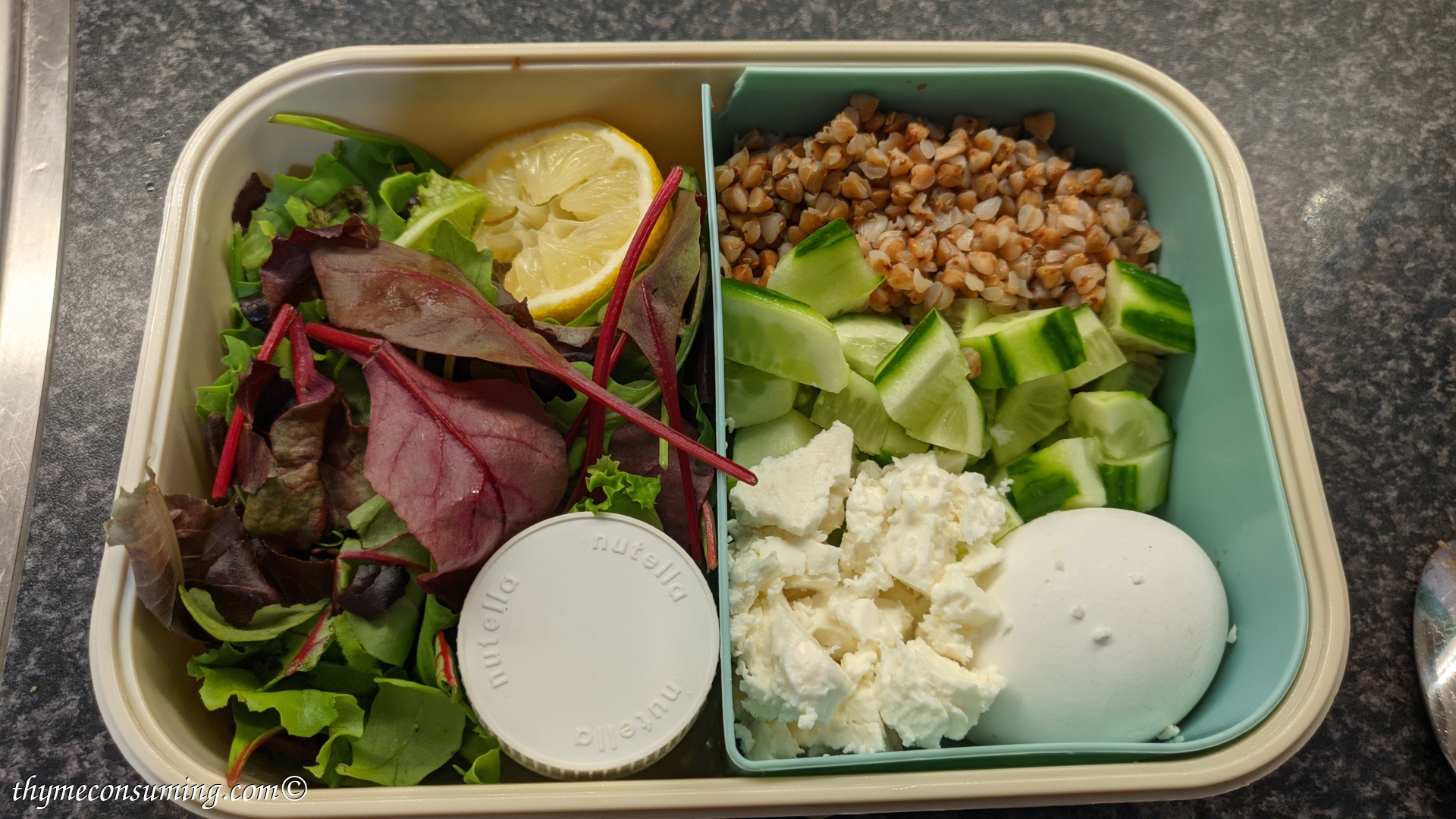 - Lunch box with buckwheat, green salad, feta cheese and egg: