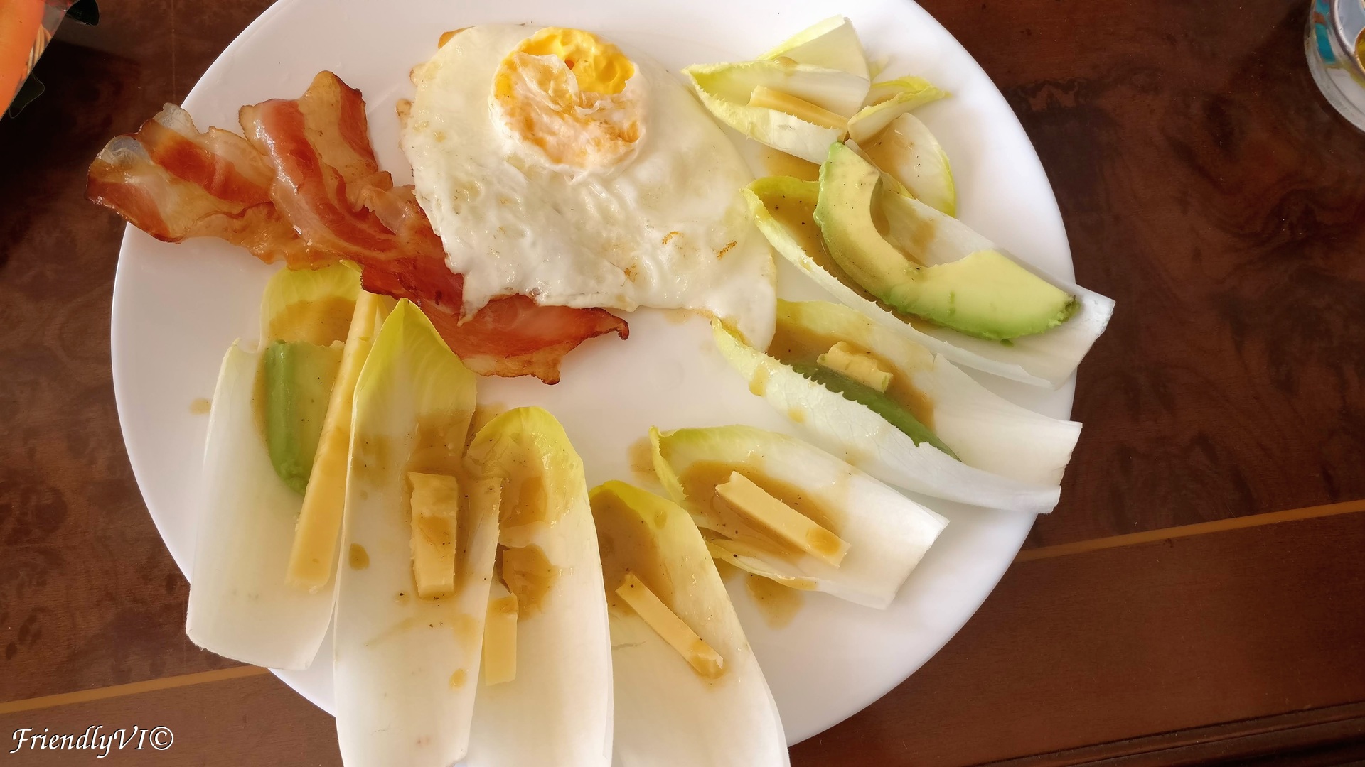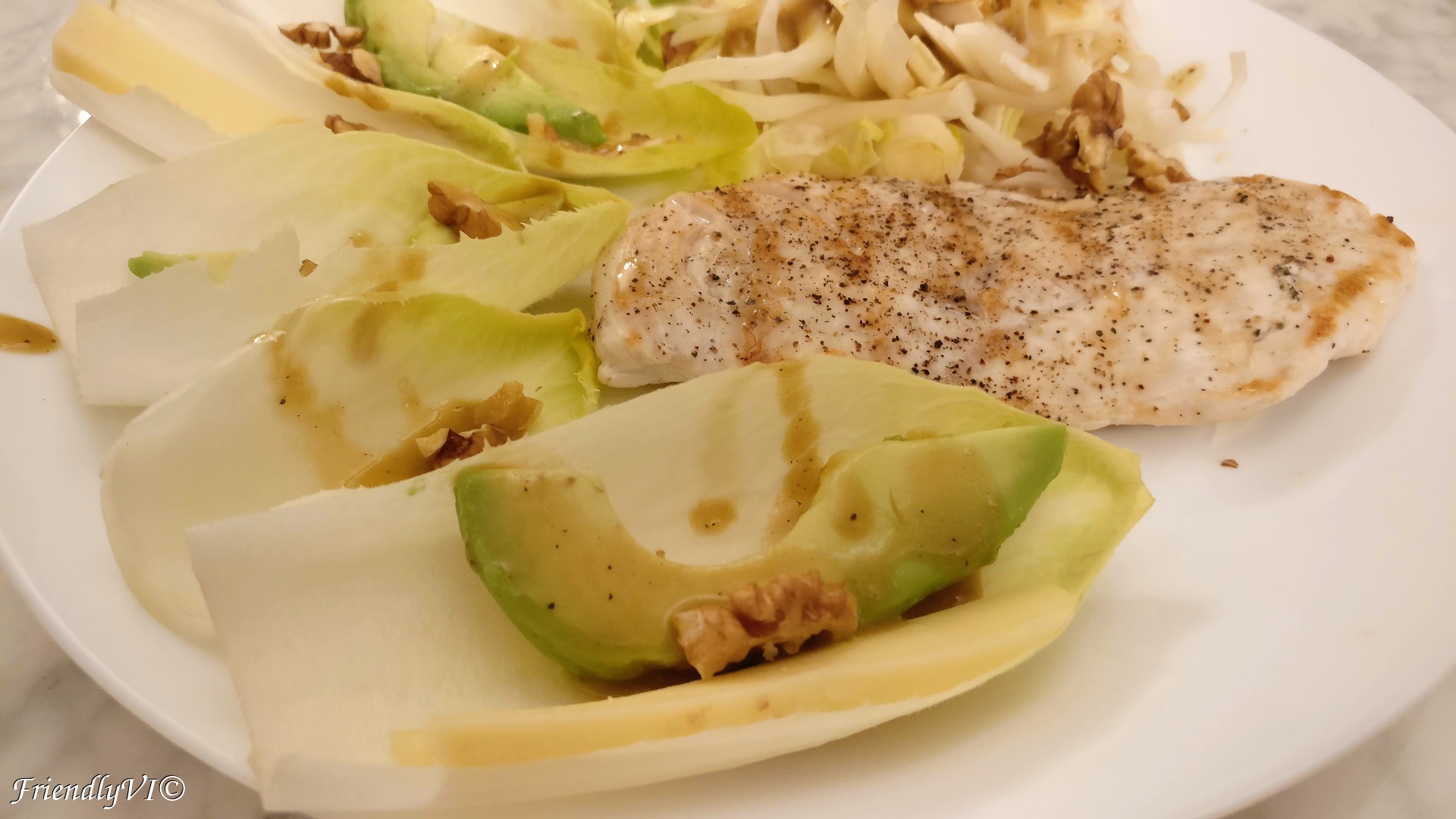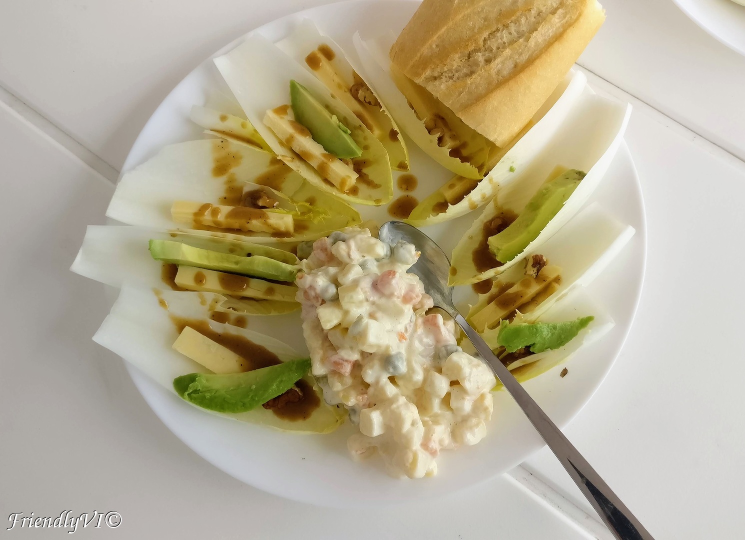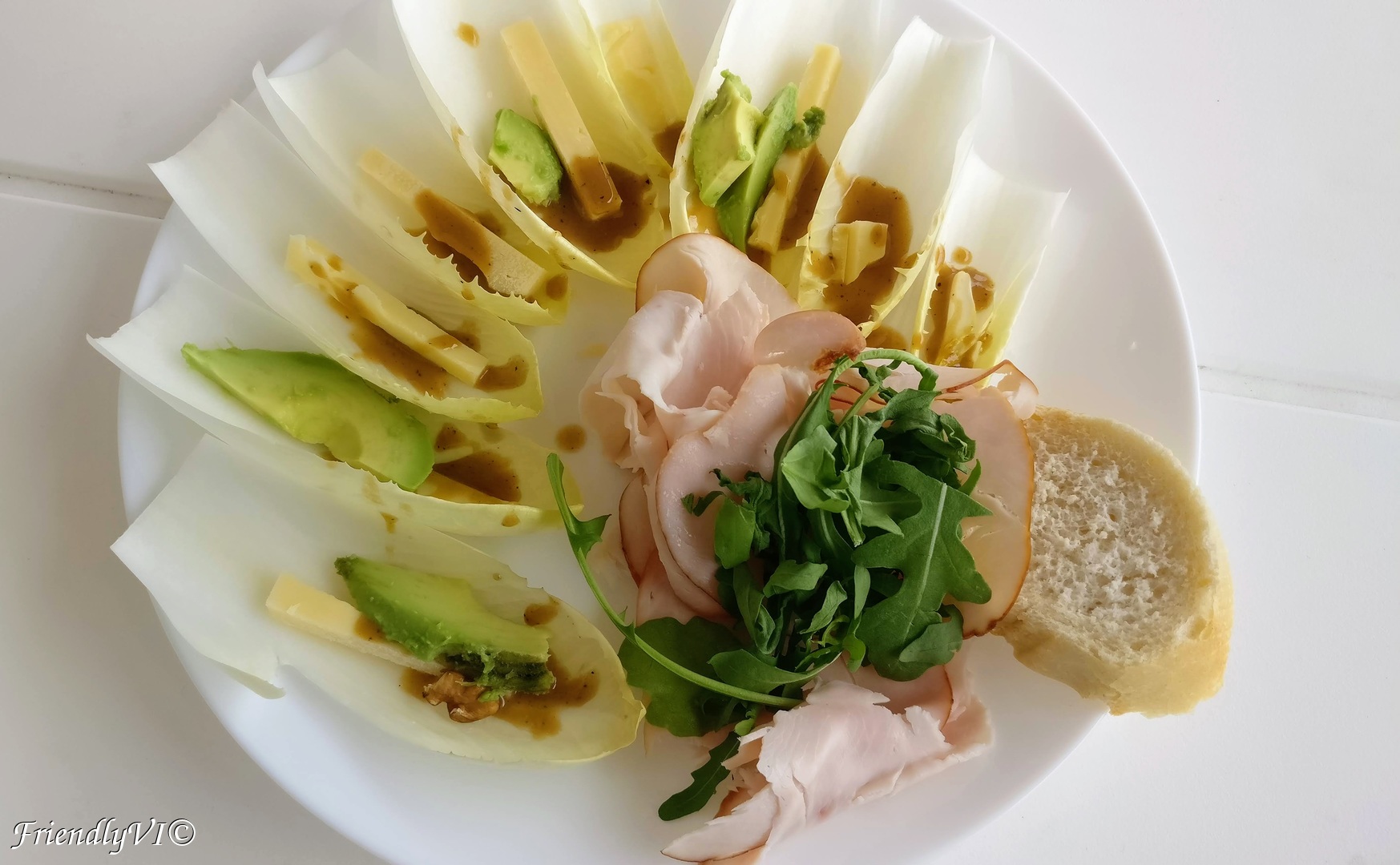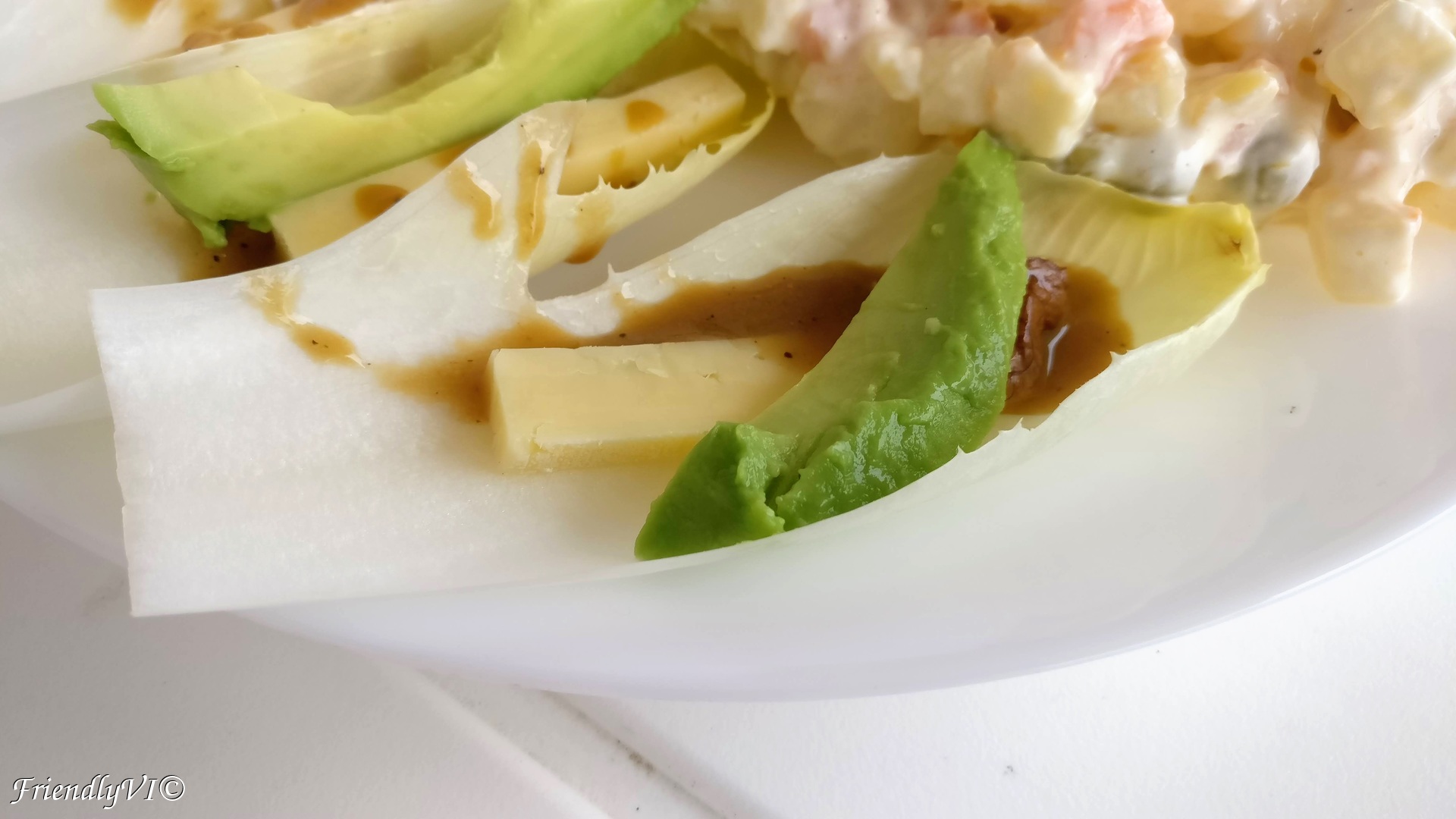 - In the tiny endive boats put the cheese, avocado and walnut and sprinkle the dressing.