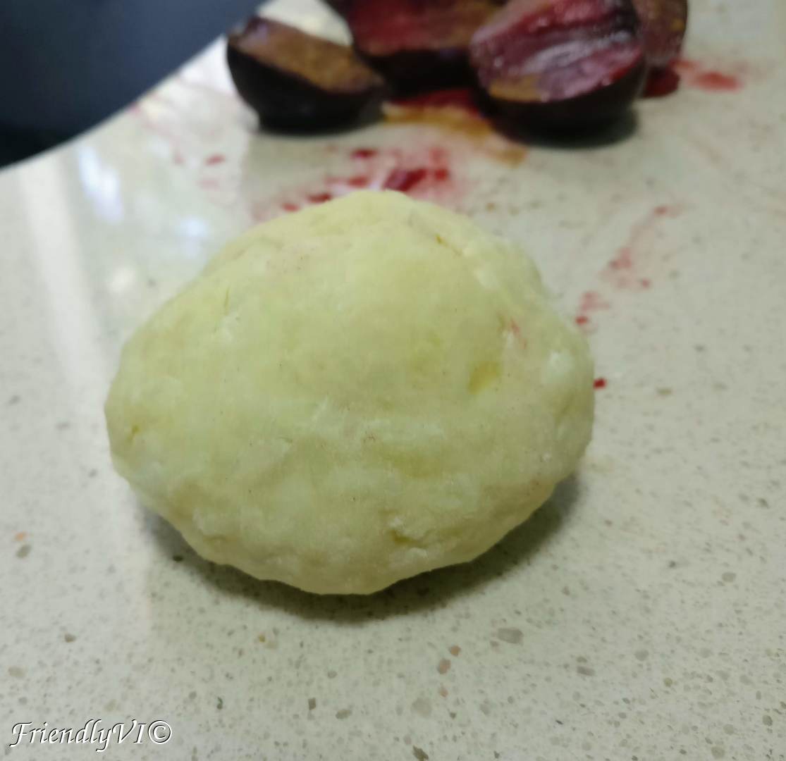 - Put flour on your hands and start to take out 1/8 of the dough. Flatten it on your palm and place the plum in the middle.