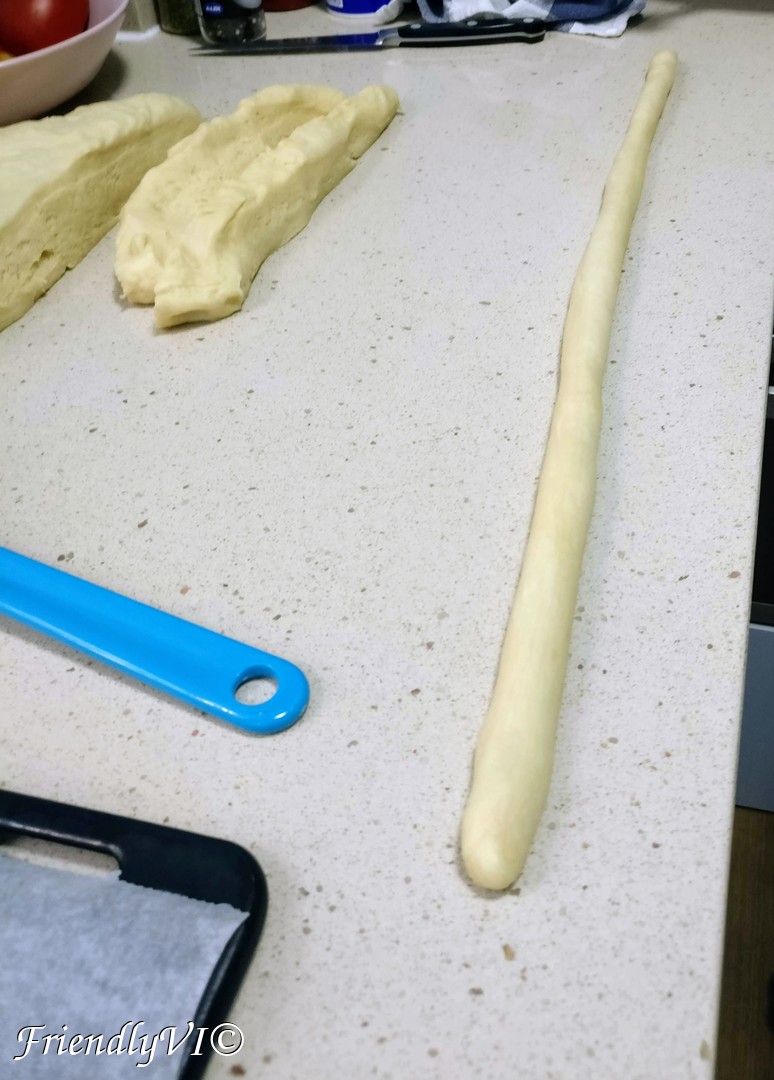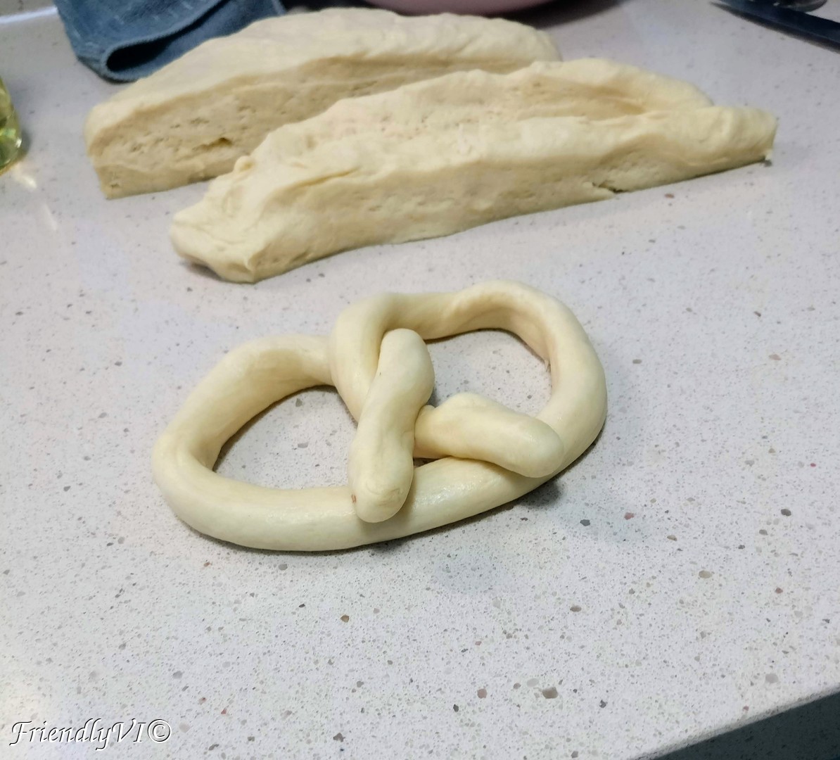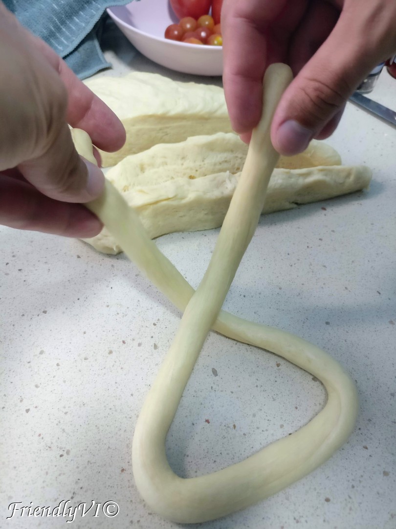 6. Roll a tube from each part, then shape it in an oval, then twist the open ends twice like in the pictures. Press the ends on the opposite side until they are fixed to the other part of the dough: