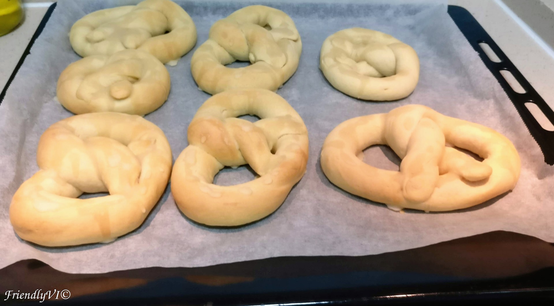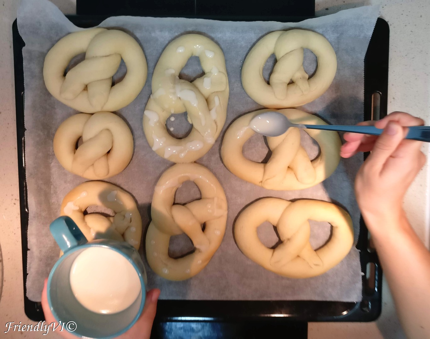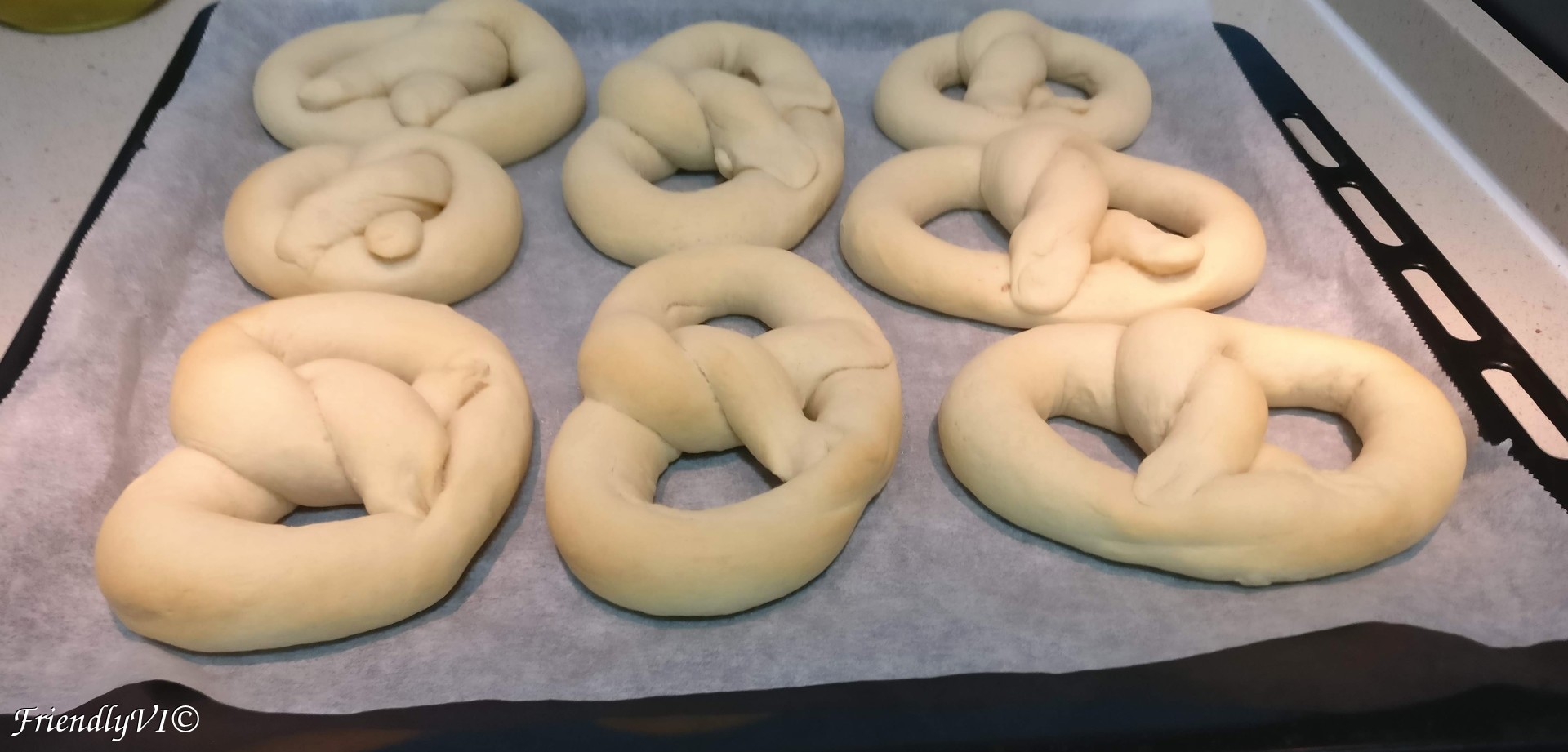 6. Roll a tube from each part, then shape it in an oval, then twist the open ends twice like in the pictures. Press the ends on the opposite side until they are fixed to the other part of the dough: