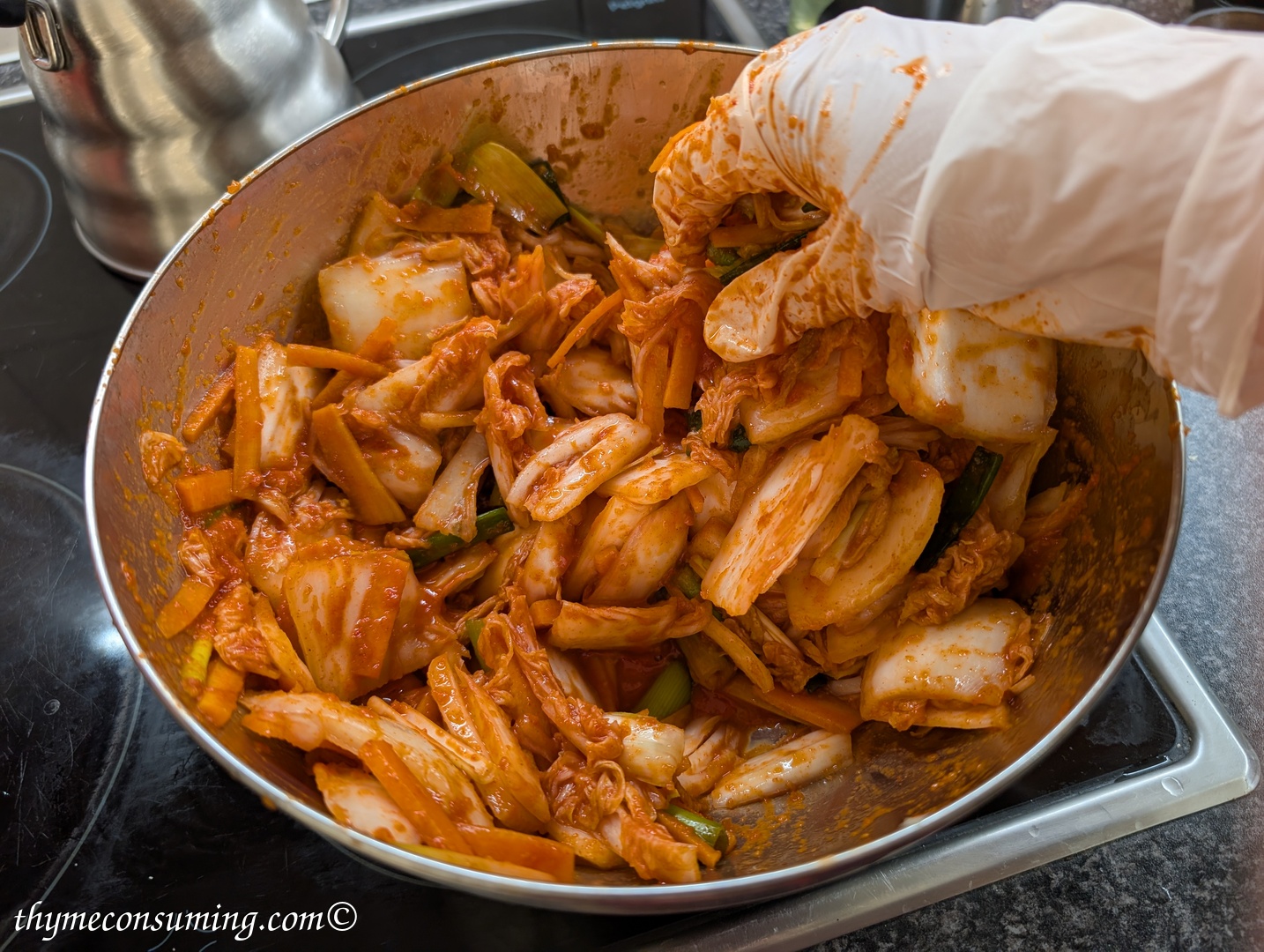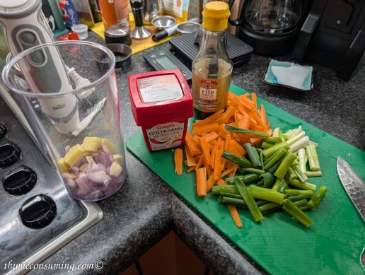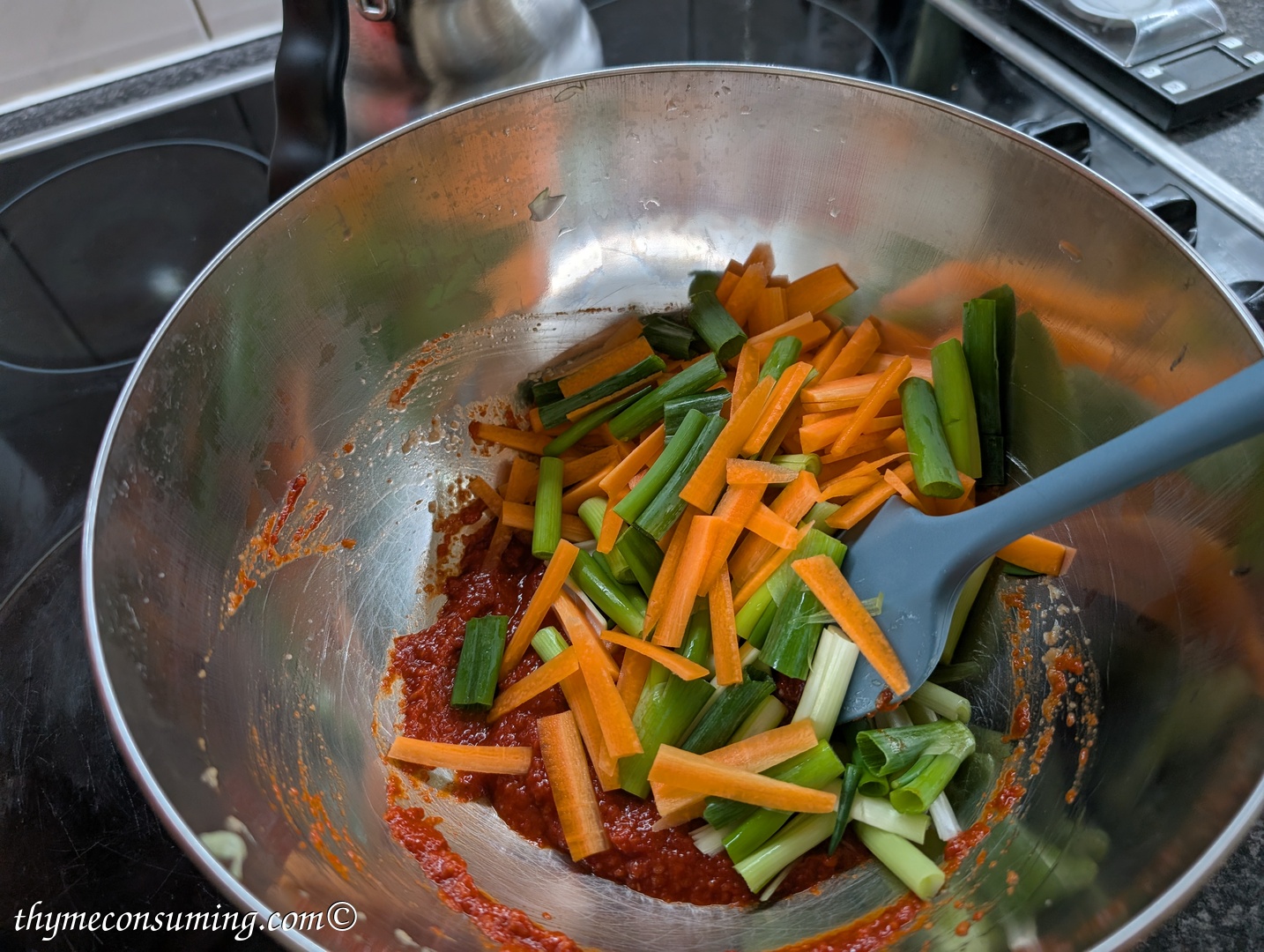 - In a big bowl add the gochujang paste and then the garlic-shallots-ginger paste and the carrots and spring onion.