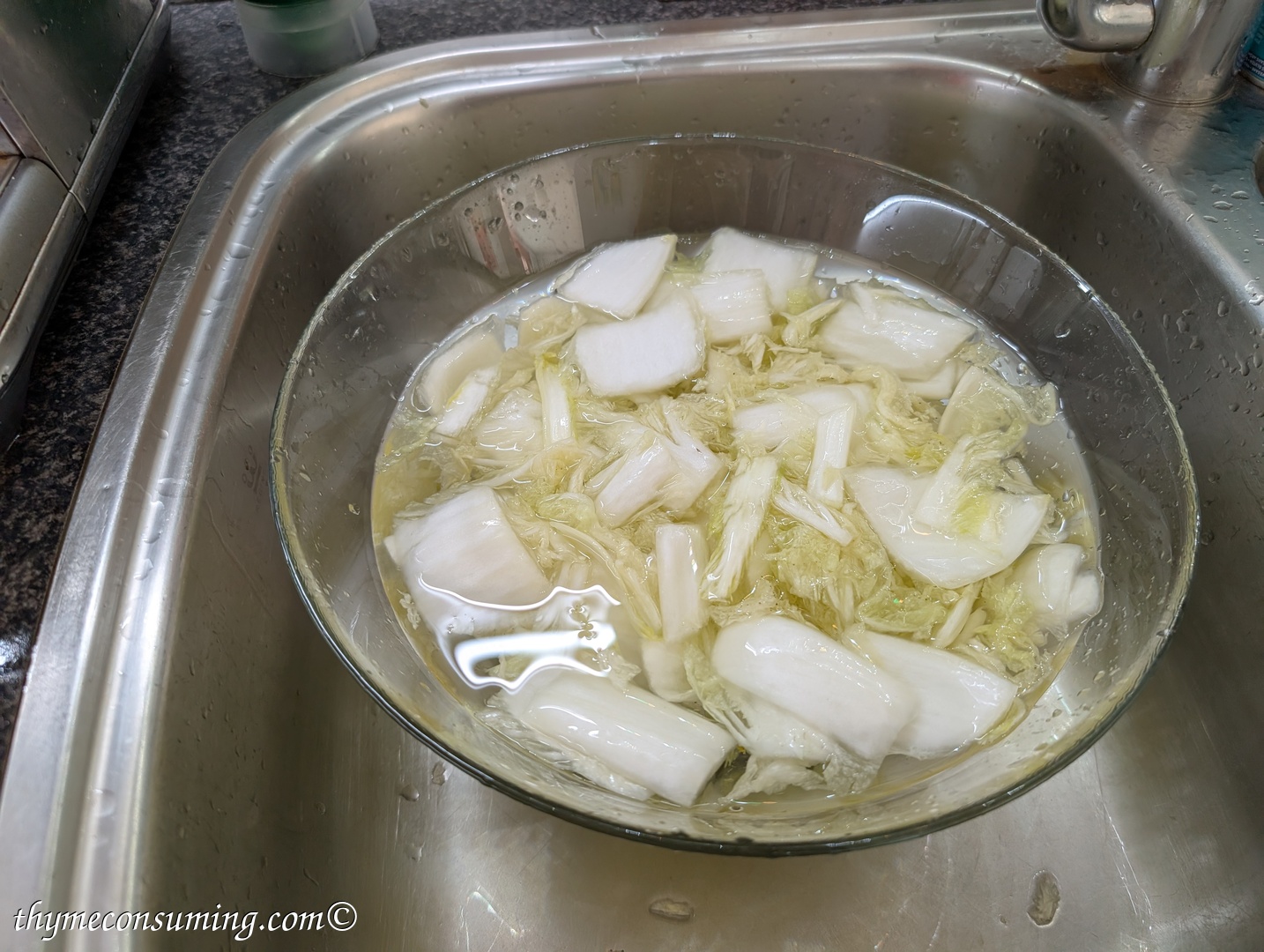 - Cut the Chinese cabbage in half, then every half in half again on the longitude and then in smaller pieces in the latitude. This is not a precise science, the idea is to make the bite sizes you want.