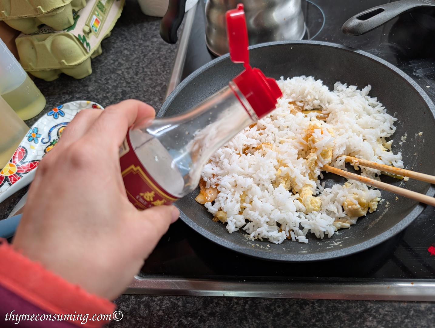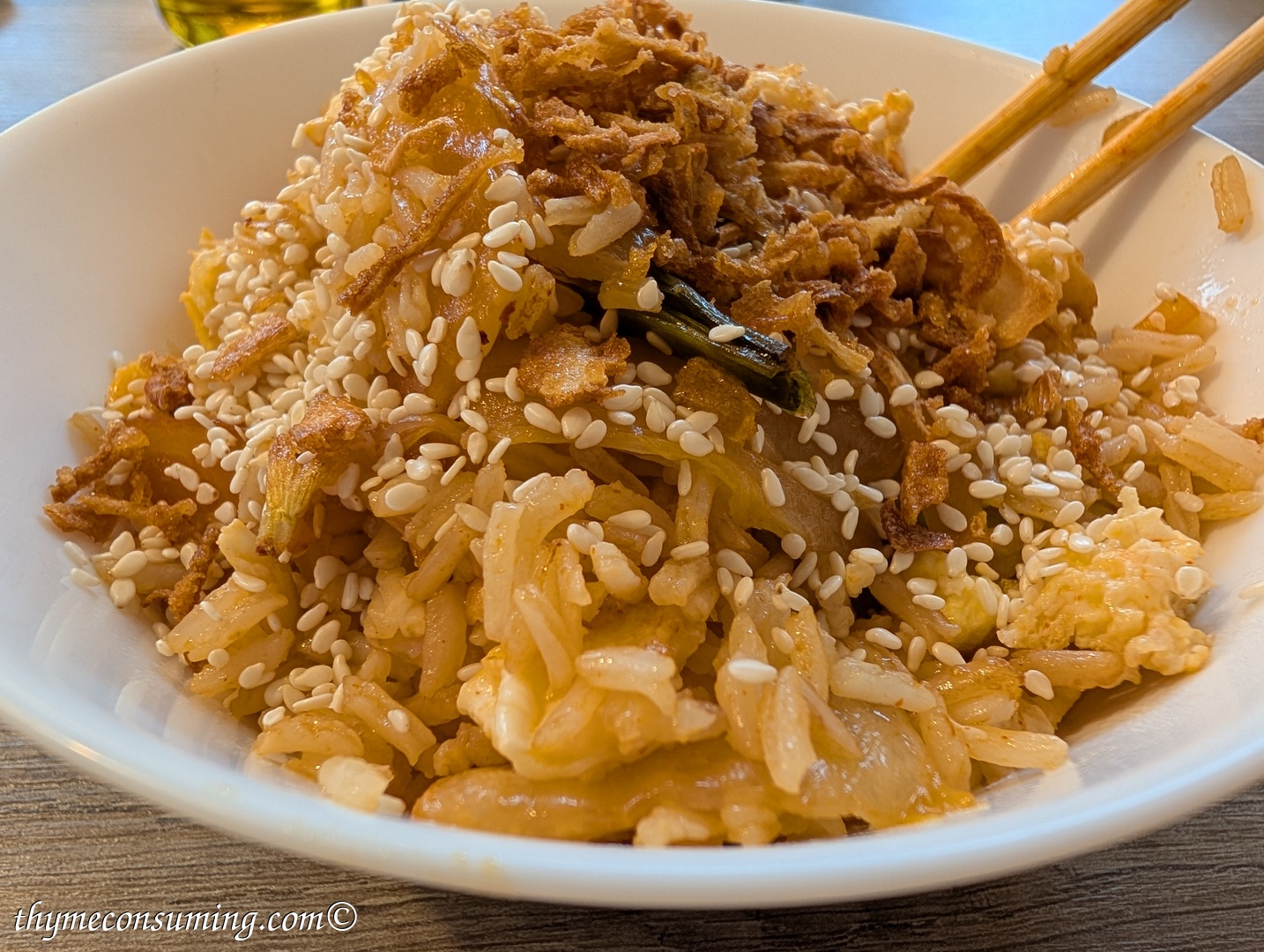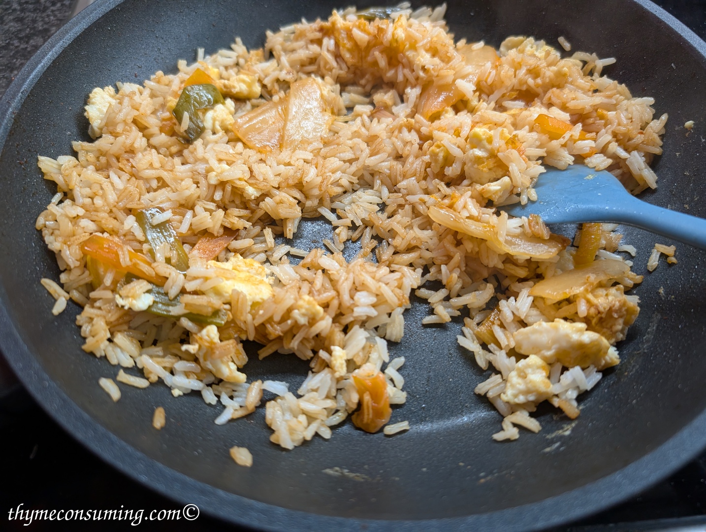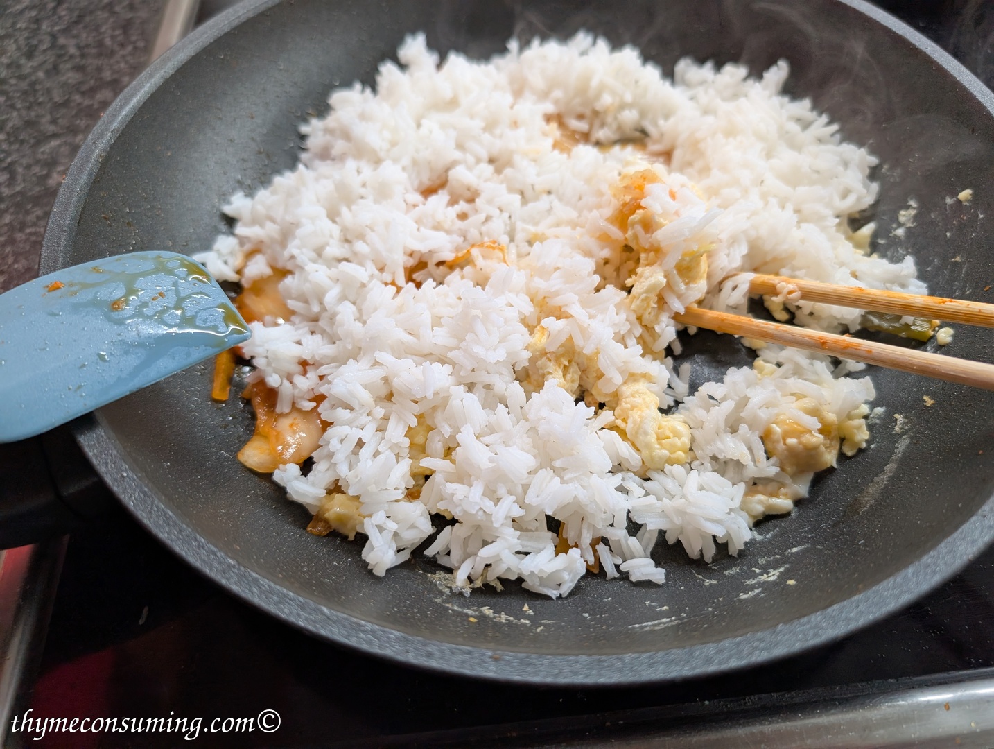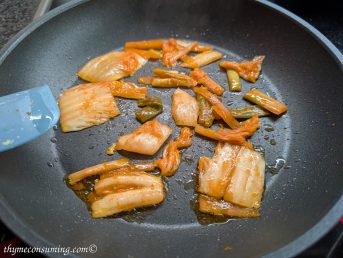 - Kimchi fried rice: fry first the kimchi in a bit of oil, place it to the side in the pan and add an egg, quickly stir it with chopsticks. Add the cold rice with some sesame oil. Add soy sauce to taste and preferably some MSG. Then serve with sesame seeds on top and fried onion.