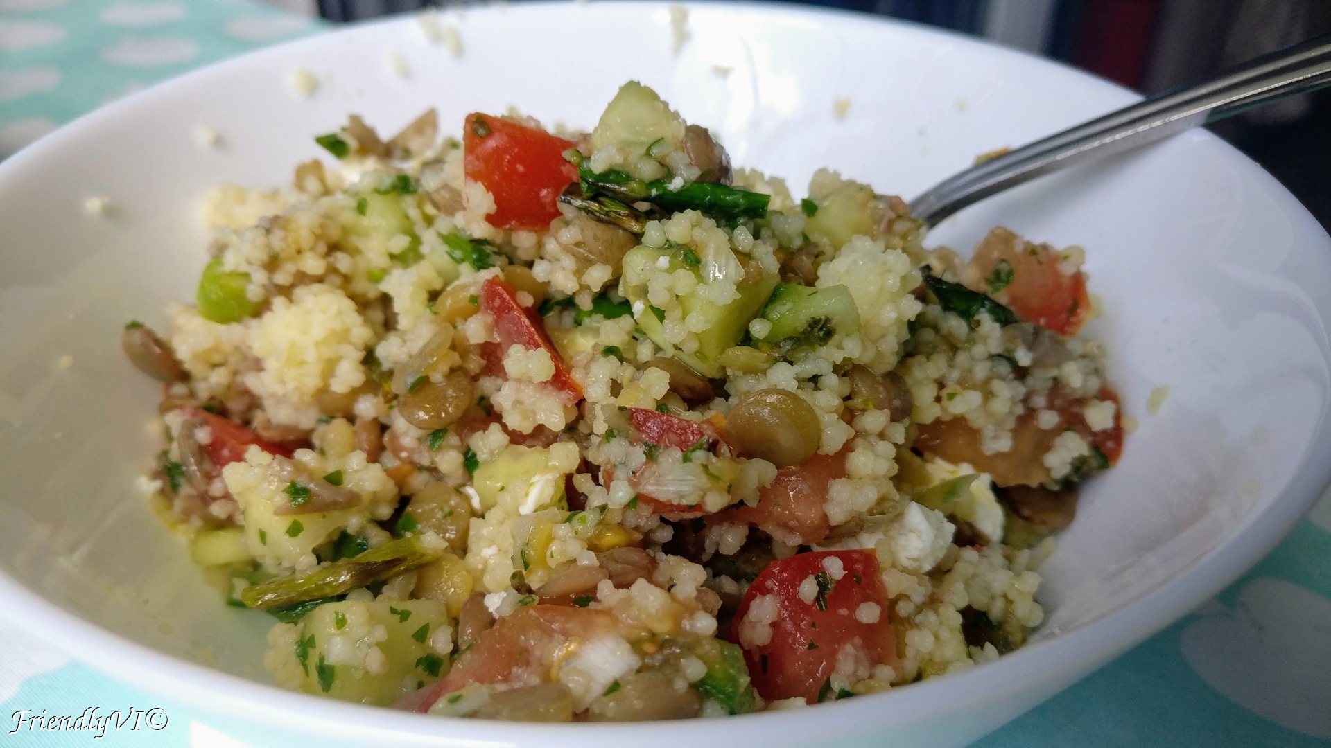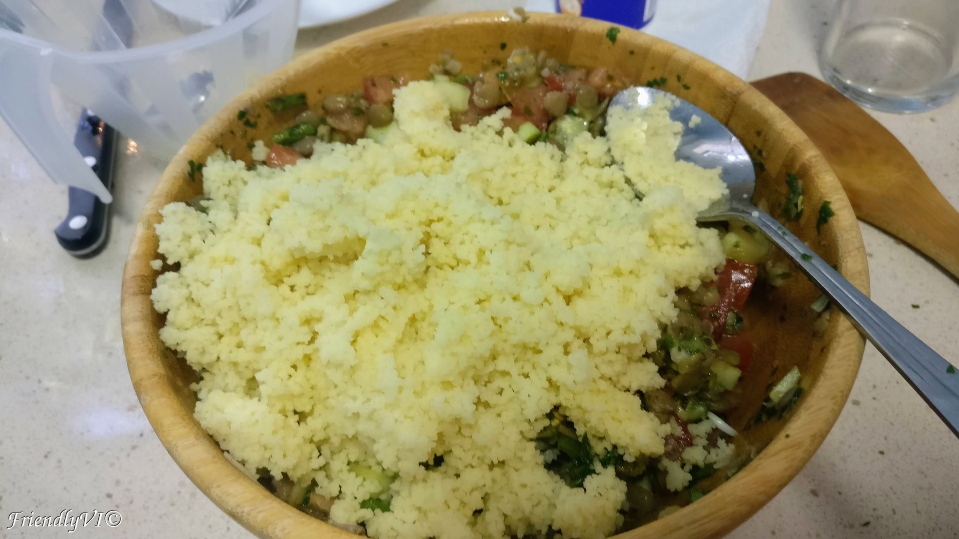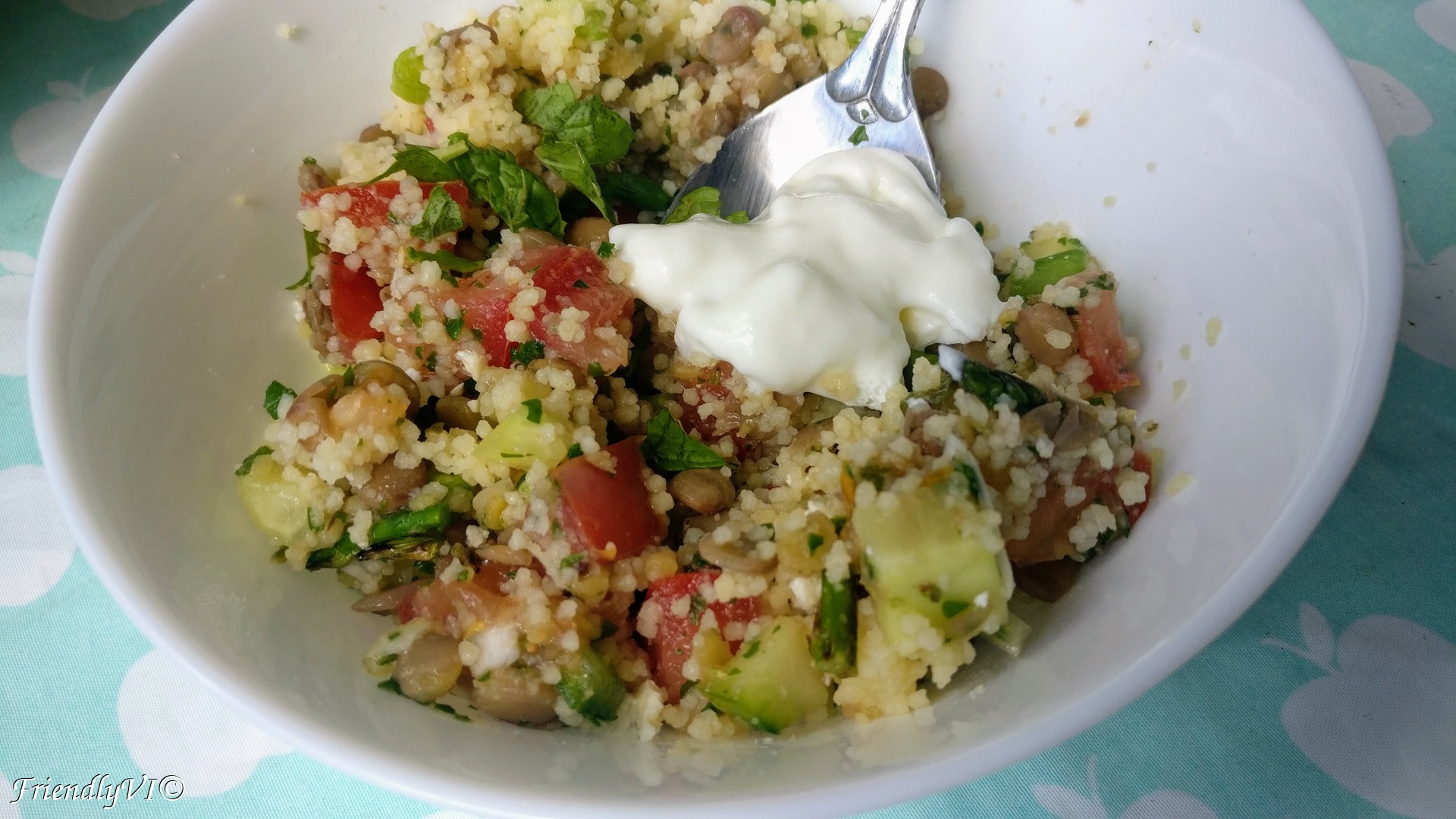 - Assemble the salad: cucumber, tomato, lentils, asparagus, parsley, cooked cous-cous and add the dressing and mix well.
