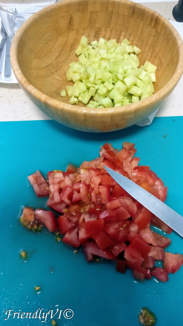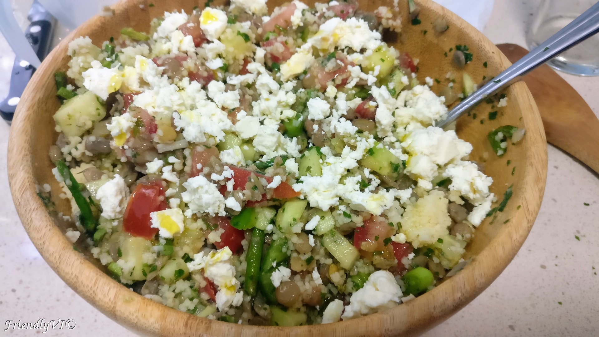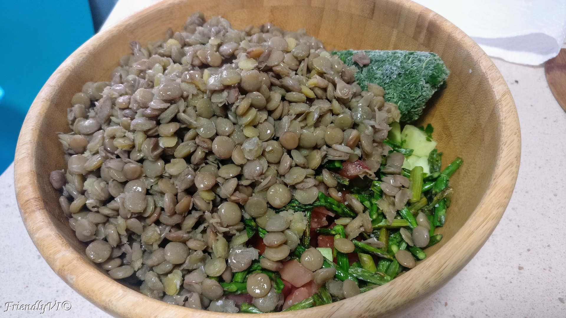 - Assemble the salad: cucumber, tomato, lentils, asparagus, parsley, cooked cous-cous and add the dressing and mix well.