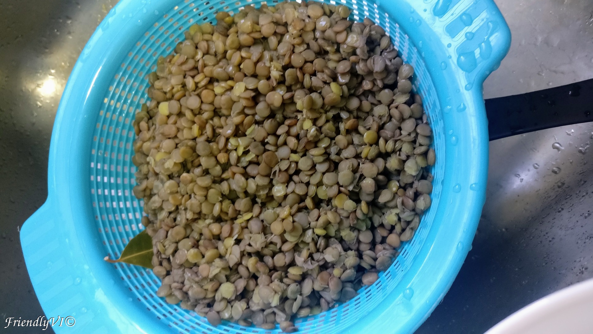 - Boil the lentils according to the instructions on the package – add one laurel leave in the water.