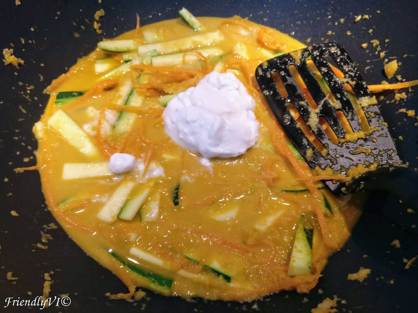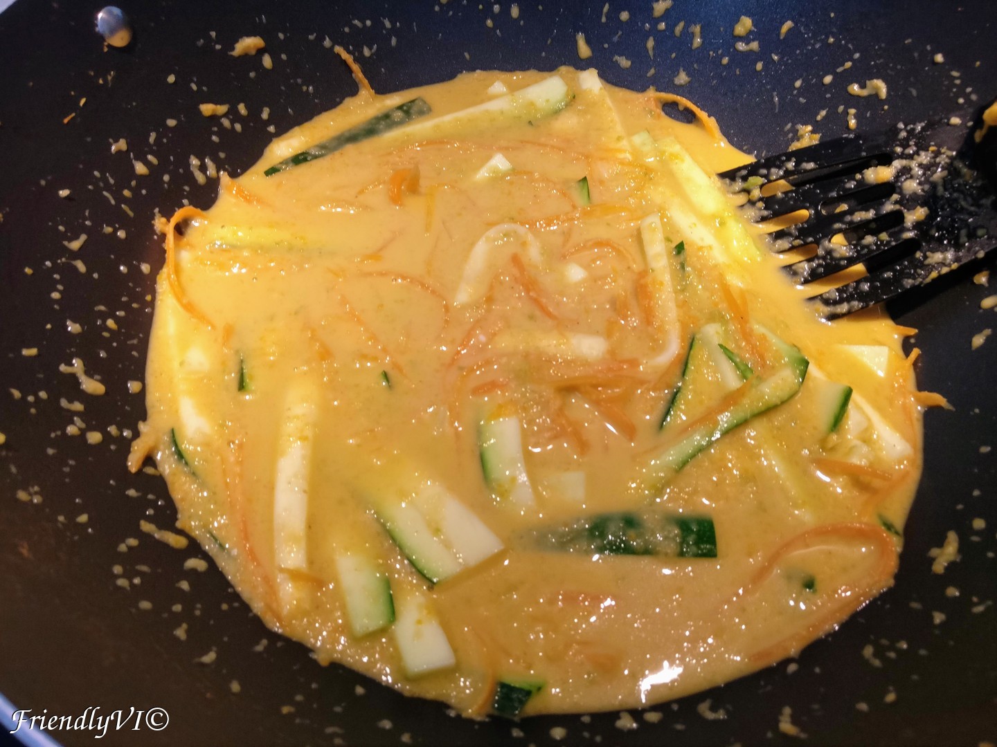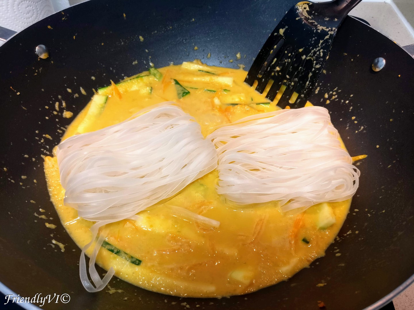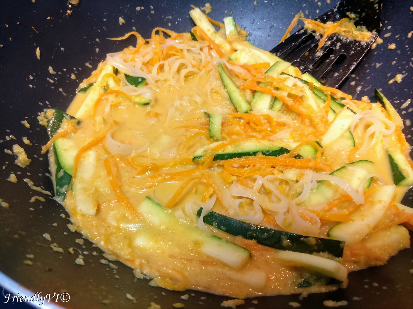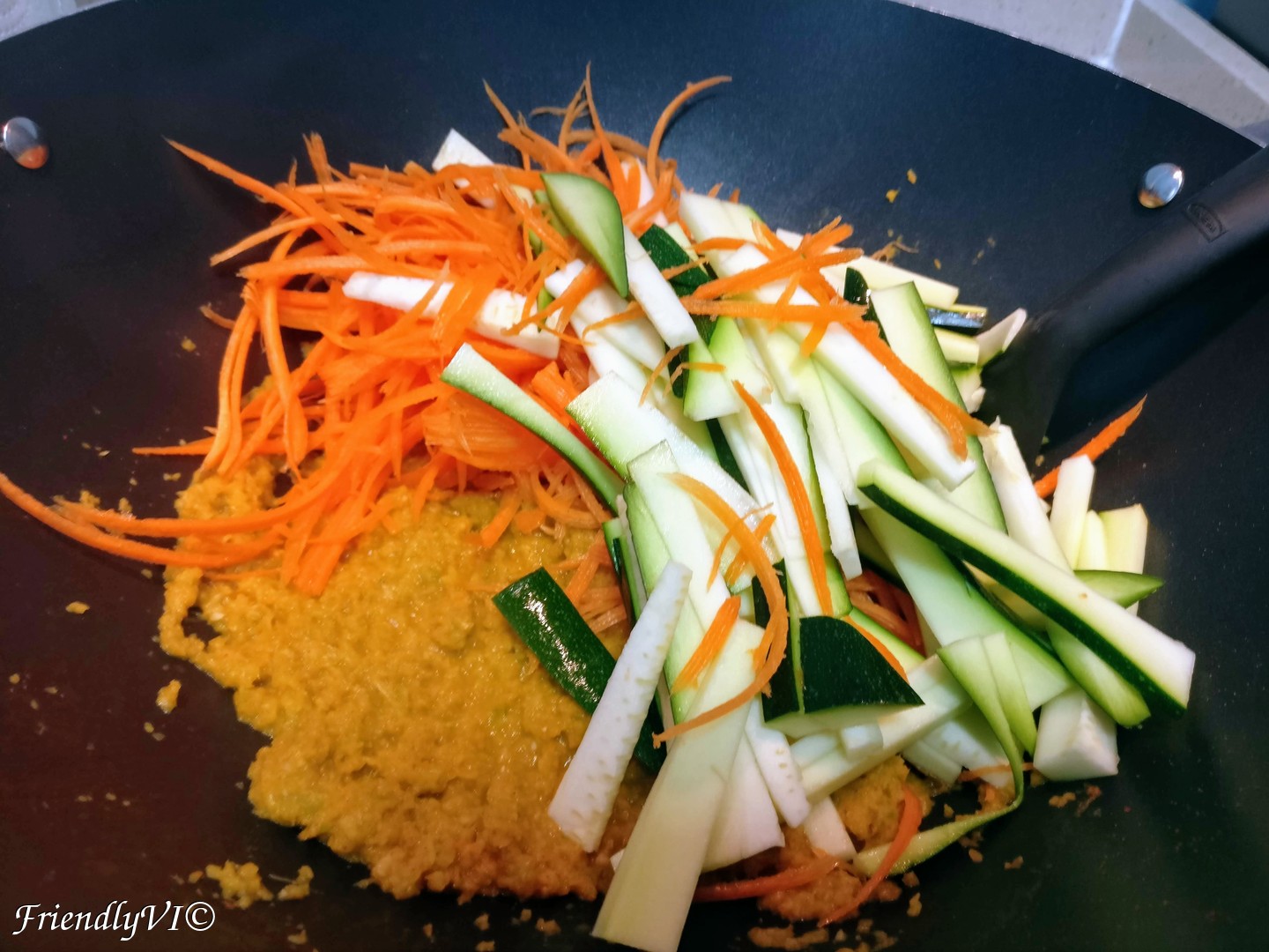 - In the meantime cut into long and fine slices the carrots and zucchini, add them in the wok and mix them in.