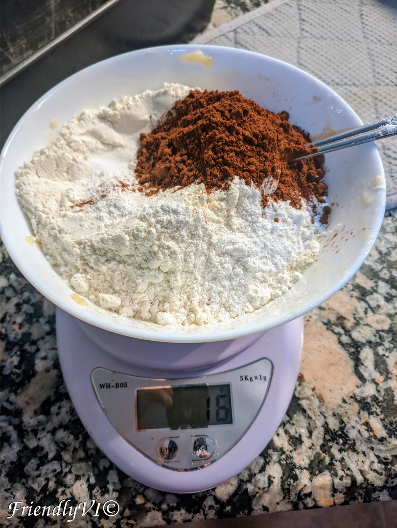 - Mix the flour with the baking powder and soda and the cocoa powder.