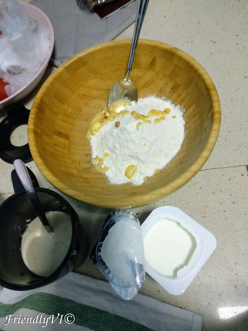 - Add in the flour: the melted butter, activated yeast and yogurt.