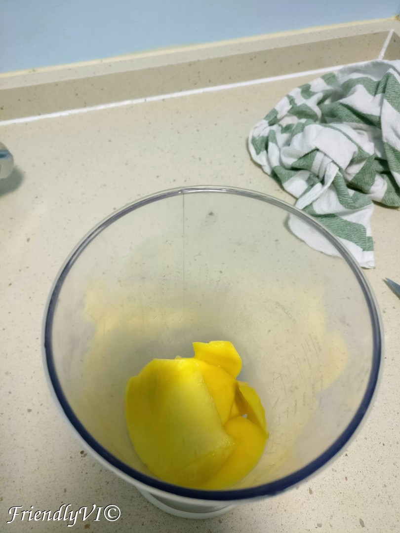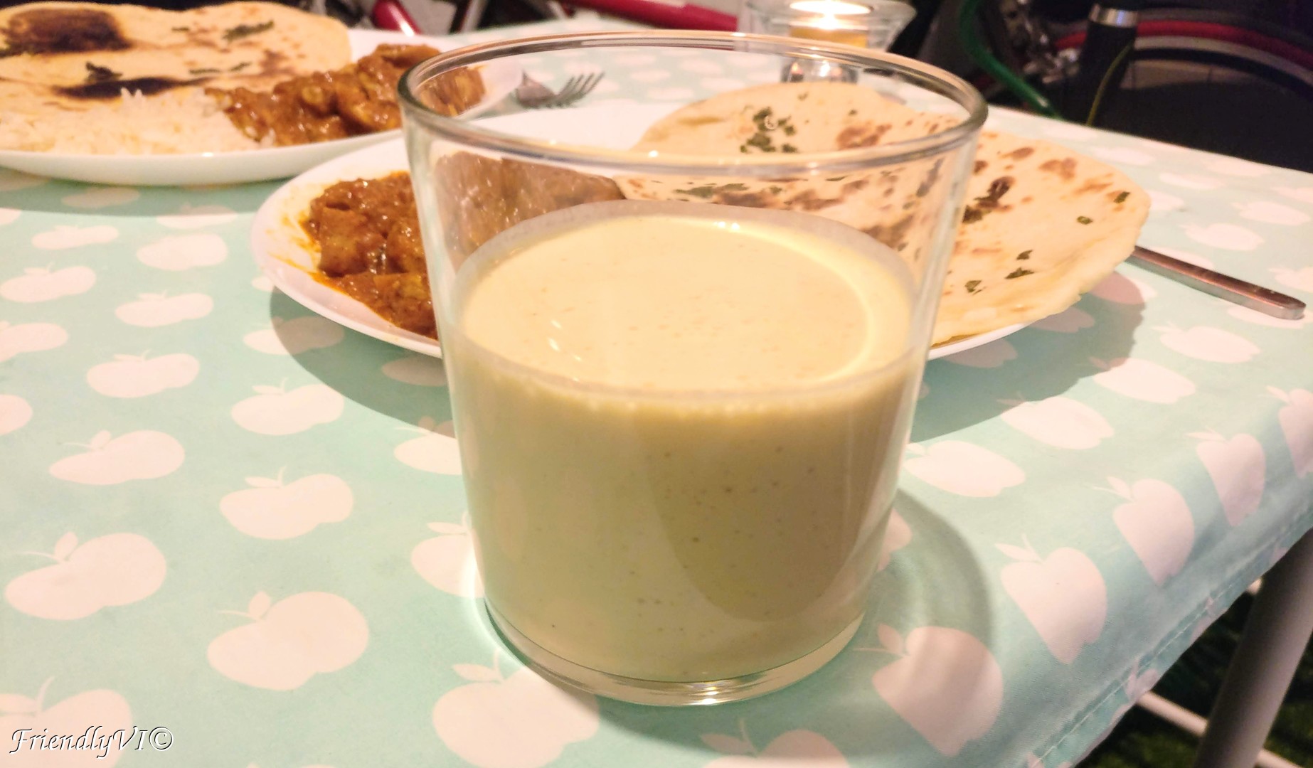 This is an incredibly easy recipe. Blend in a tall glass a cut mango, 2 yogurts and some water (100 ml max), 1/4 tsp of coriander and you have two portions of one of the most amazing drinks!