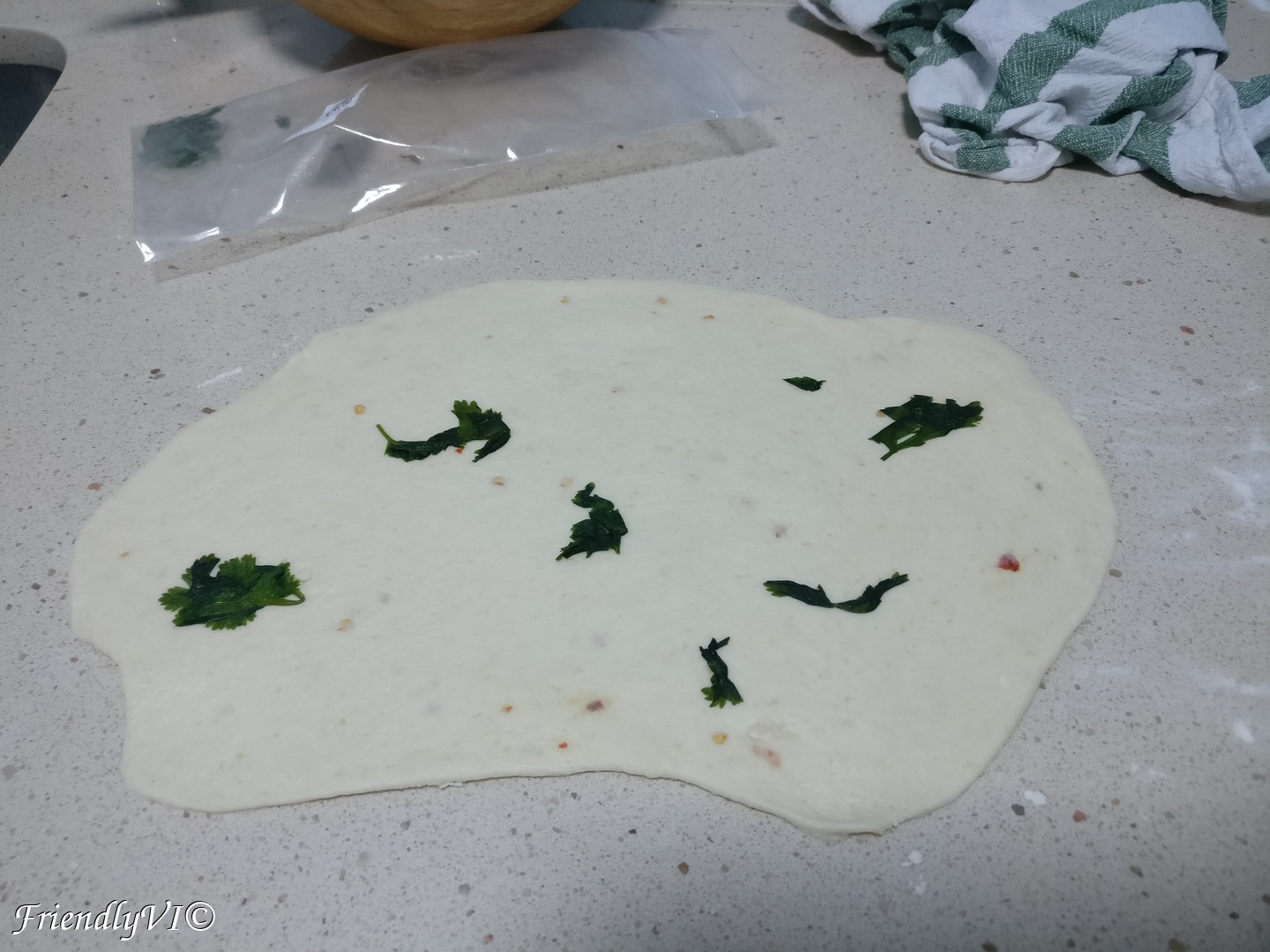 - Roll the dough in a shape that you wish and add the coriander on top.