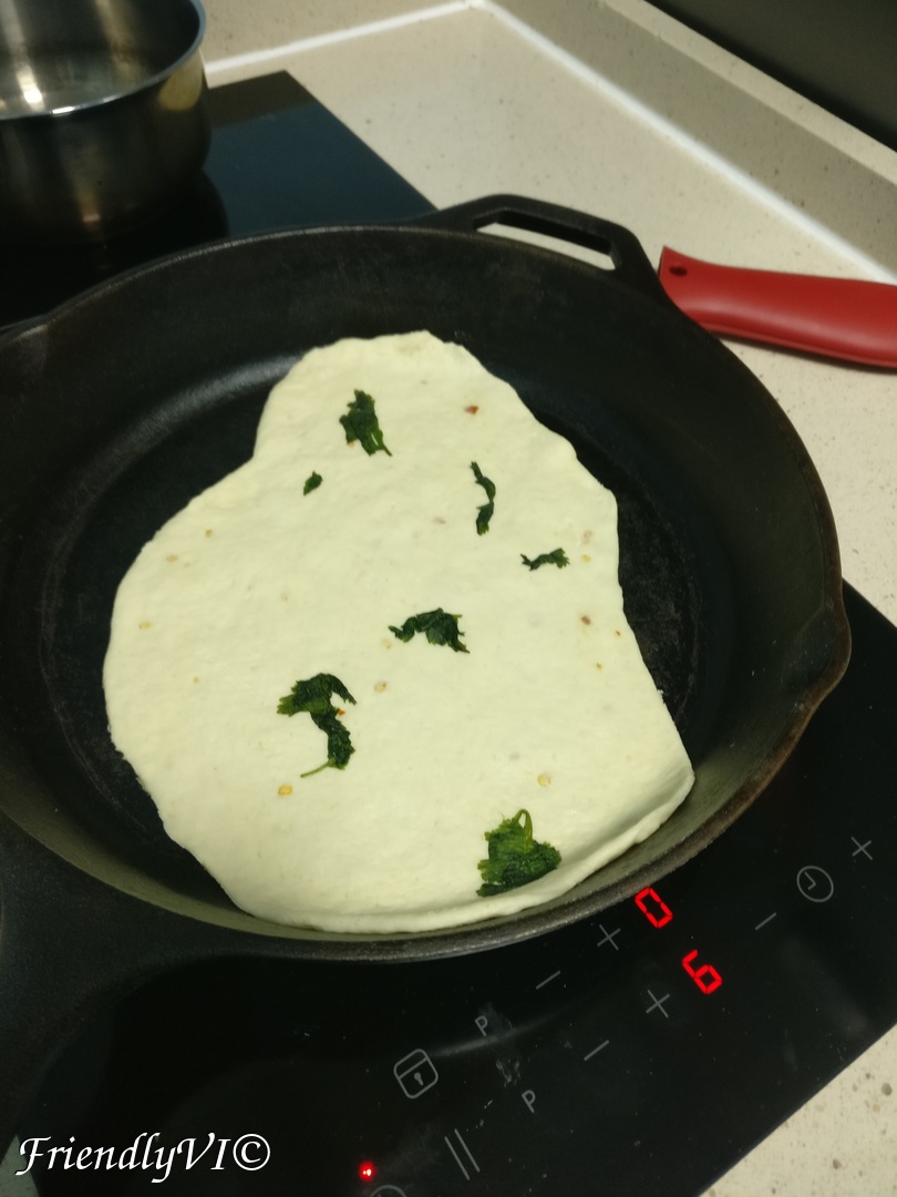 - In a very hot skillet place one portion and cook it on medium high (I used setting 6 out of 10) until the bottom cook. Flip it and press it down a bit and let it cook on the other side.