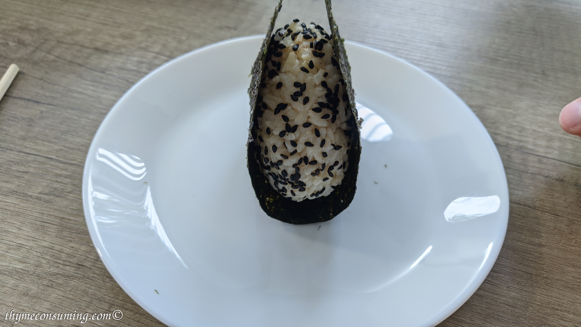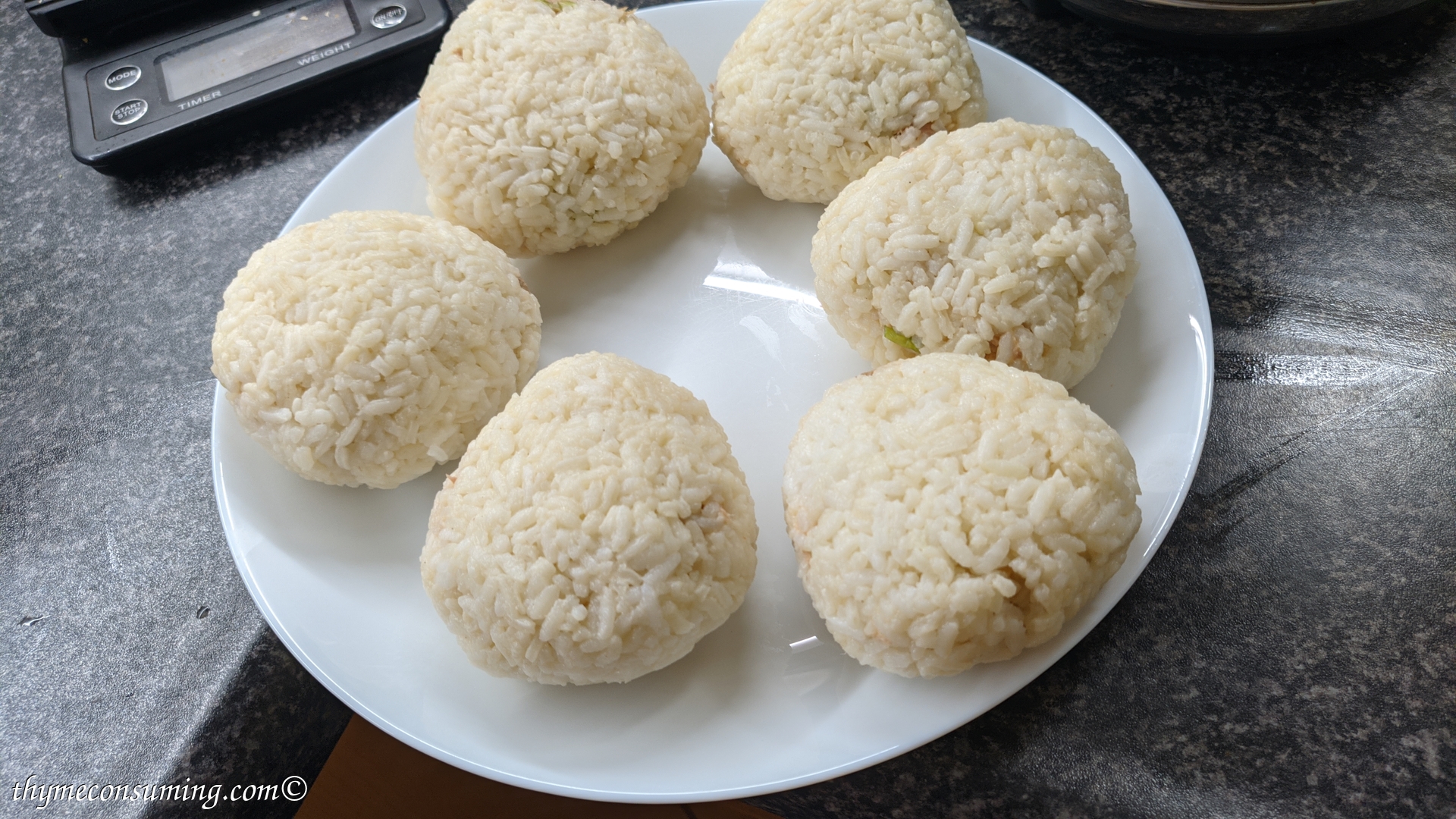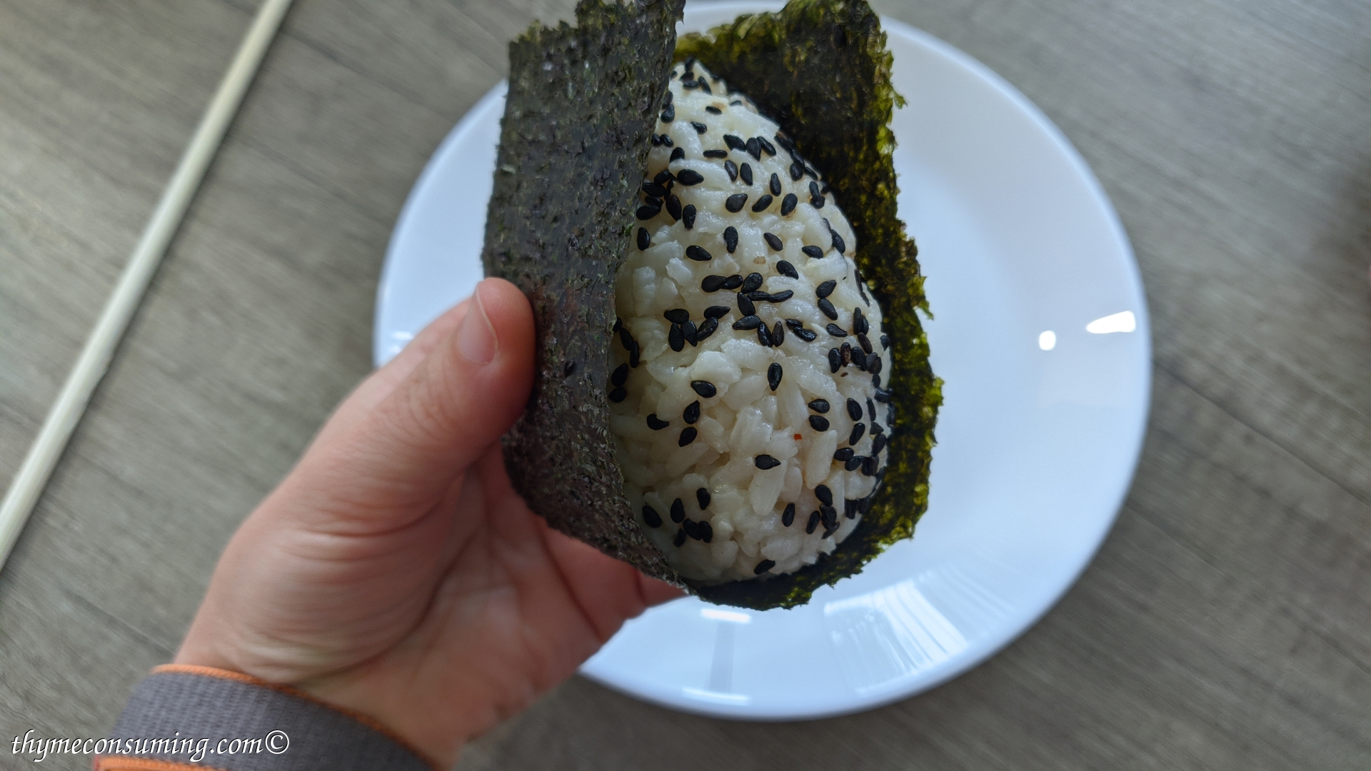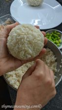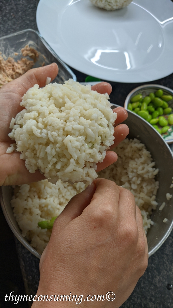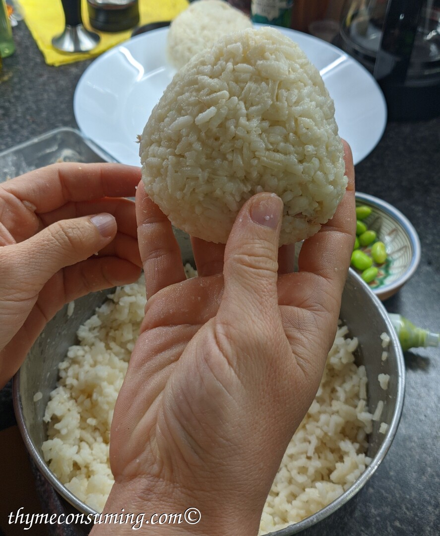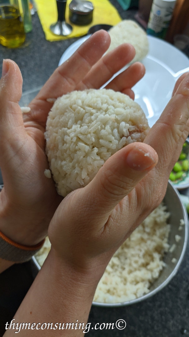 - Tricks for assembling the onigiri: do it while the rice is still warm and have your hands slightly wet. Here is how I do it in pictures: