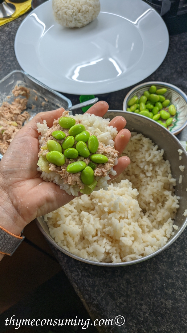 I heard about onigiri quite a lot over the past few years but never considered trying it until I did and immediately saw its great potential. I love sushi, but it is not easy to make and quite tedious. If you can get over the rice preparation, all you need for onigiri is to form a ball with your hands, and it is ready. No raw fish is involved; you just need a can of tuna or some leftovers. Of course, onigiri can be much more complicated than this, with traditional Japanese fillings inside. But all I am aiming for is to have this delicious gluten-free cold sandwich easily reproducible on a random weeknight.