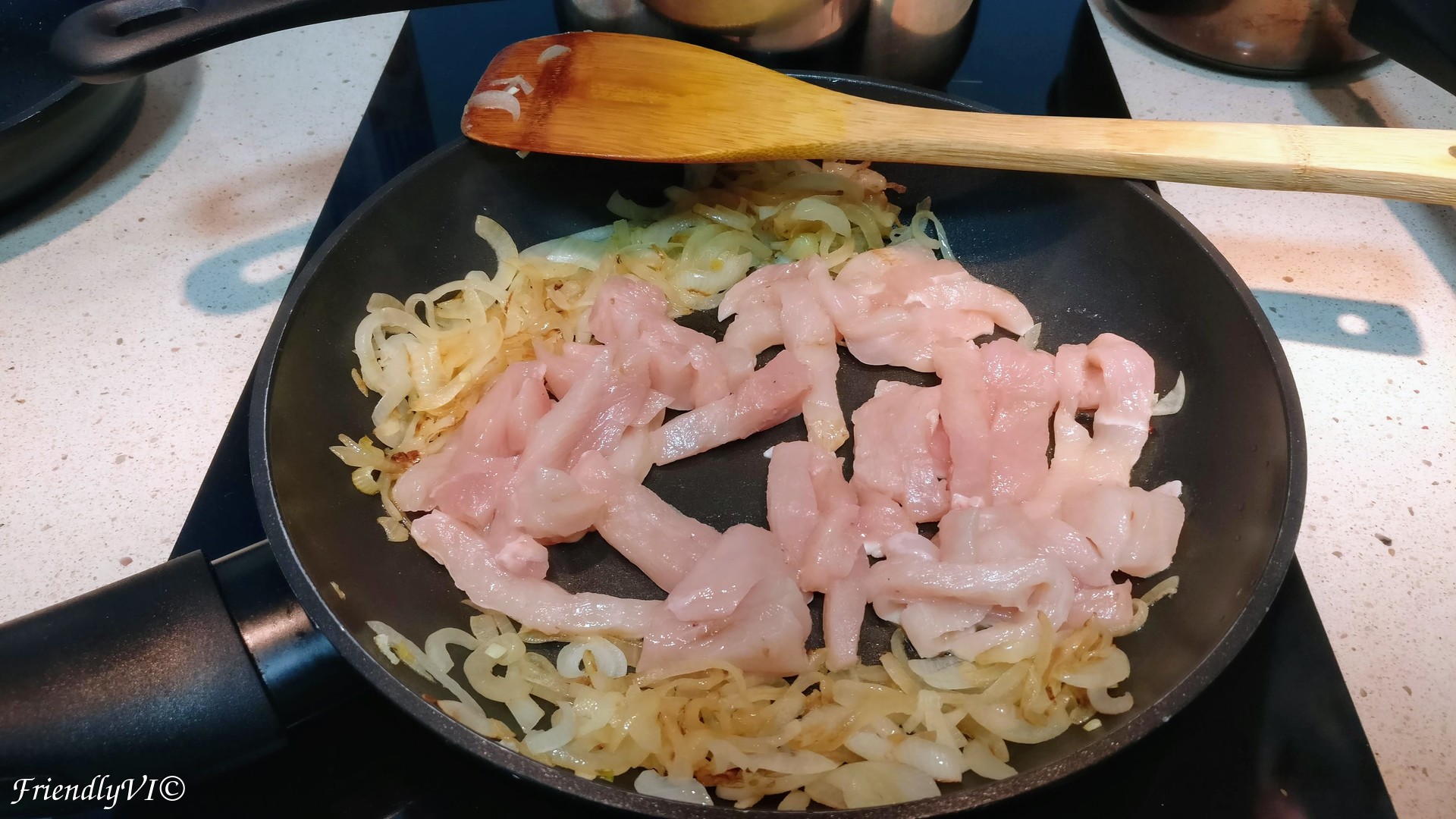 - In a big pan start frying the onion until it is golden and almost caramelized.
