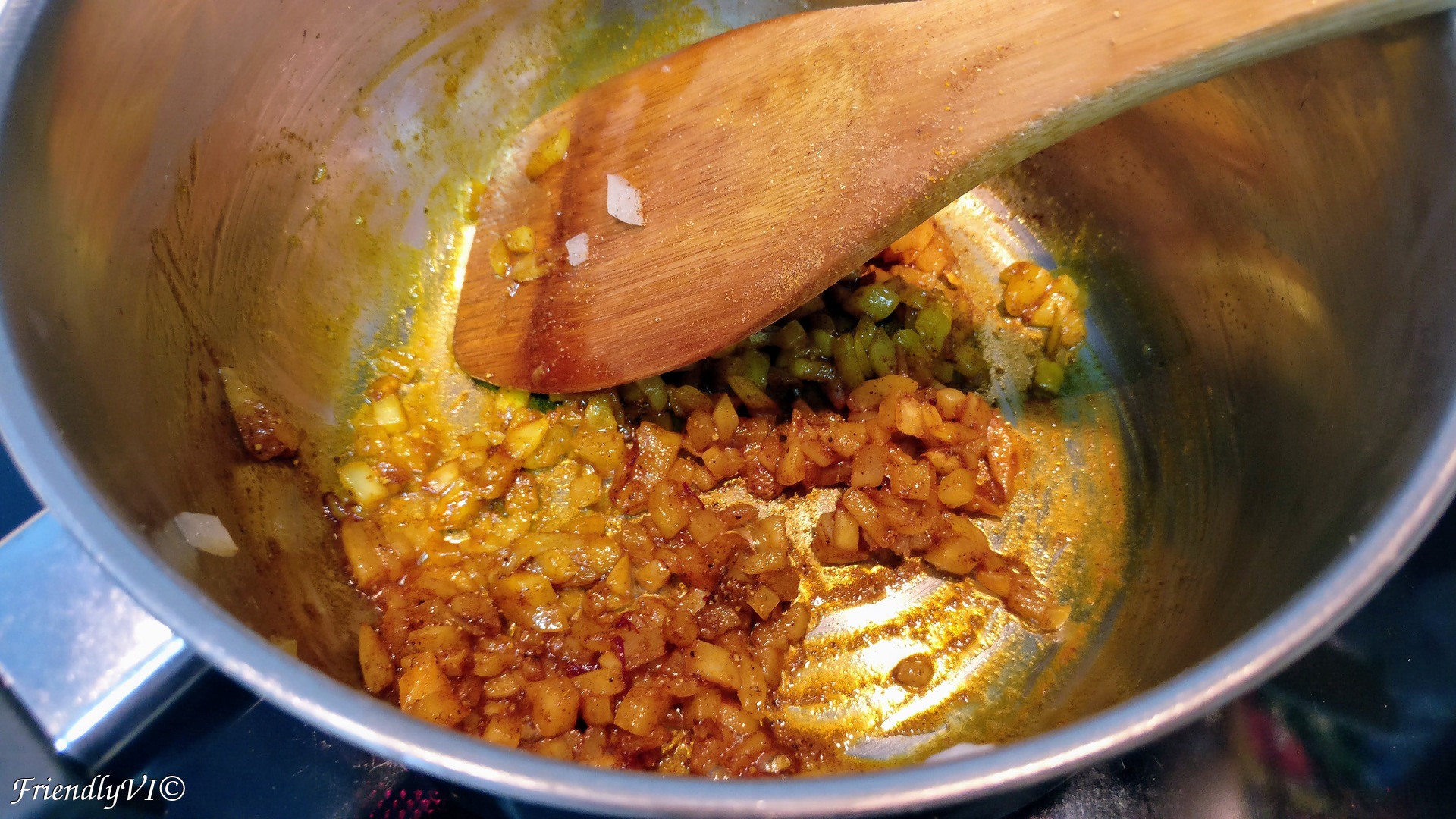 2. Fry the diced onion in a bit of oil until it is soft and golden.