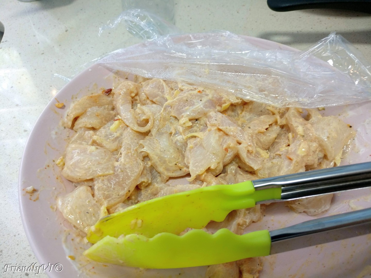 - Cut the chicken in thin slices and season it with salt and pepper. Then mix in the yogurt, diced ginger and garlic, chili flakes and cumin. Let it marinate for one hour.