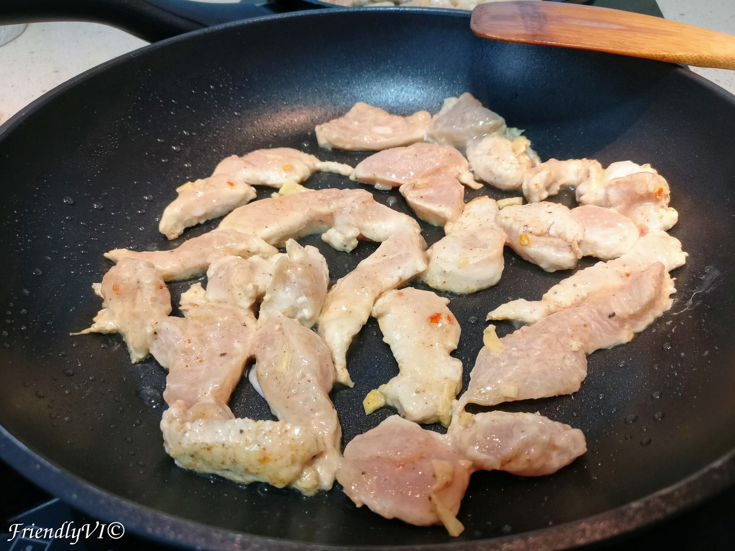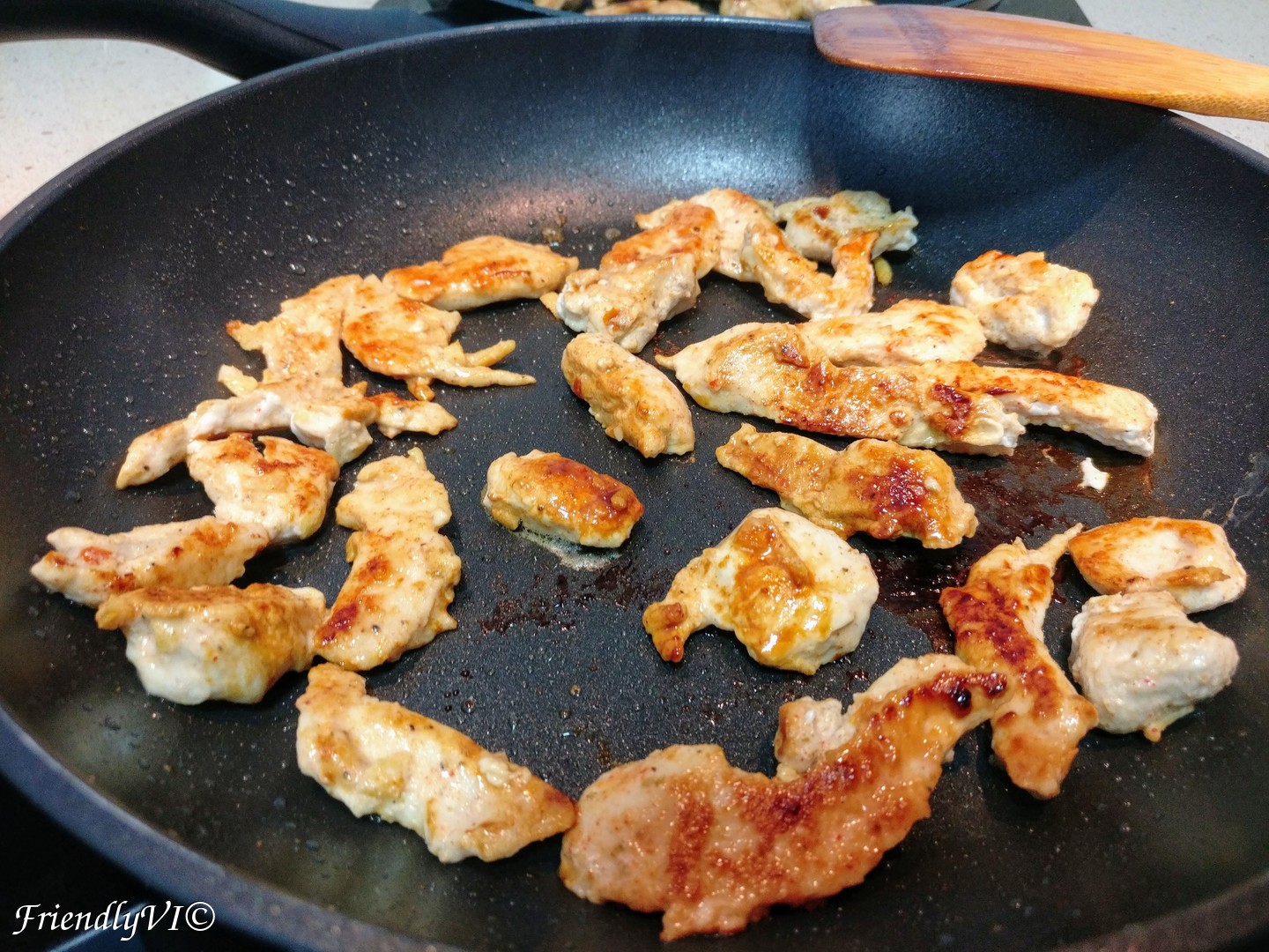 - Fry the chicken in very little oil on medium fire. I use two pans for speeding up the process. Fry it first on one side without moving, until golden. Then fry it on the other side until golden, too. Do not overcrowd your pan!