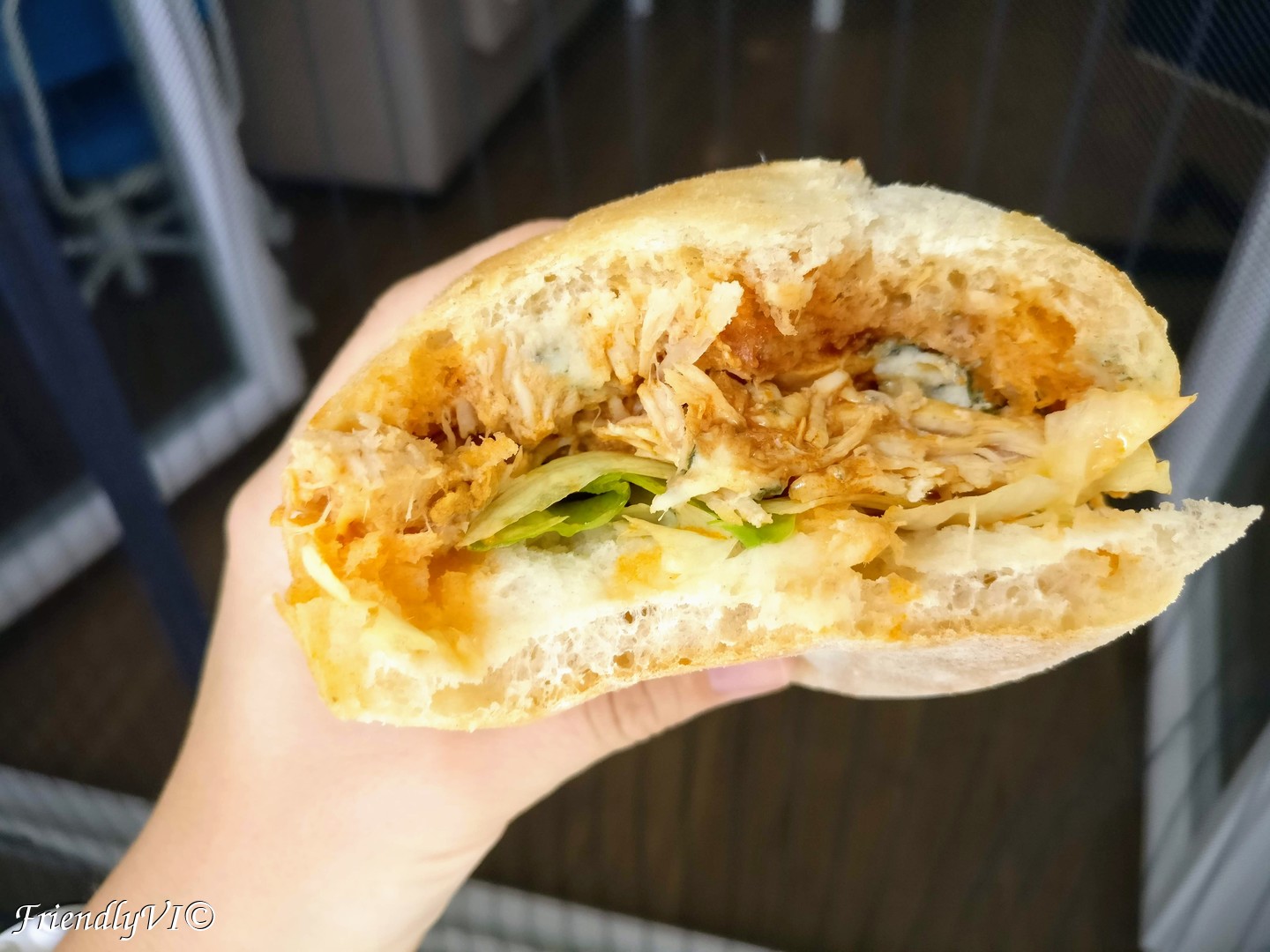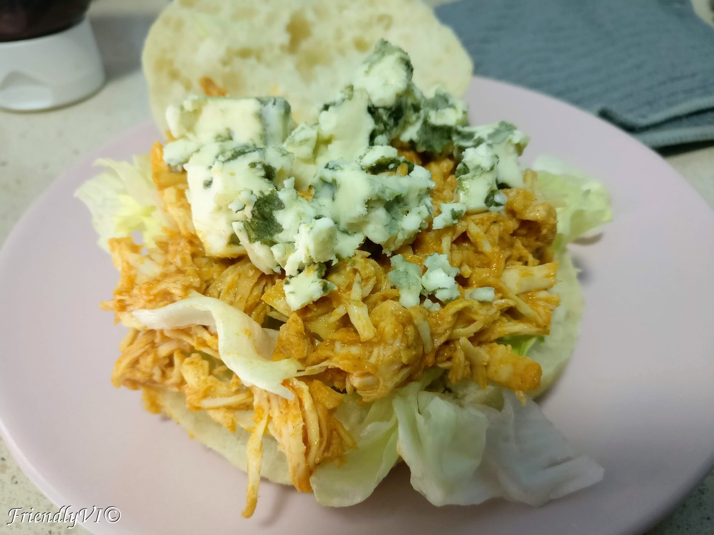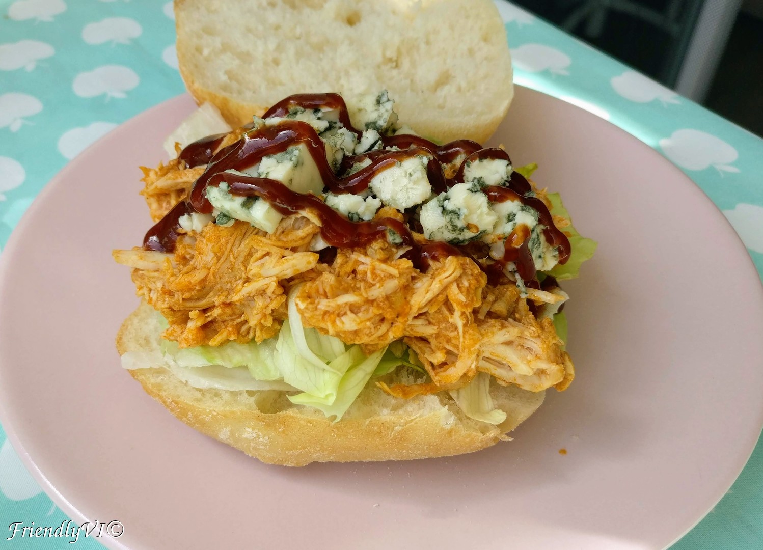 Pulled chicken sandwich with blue cheese