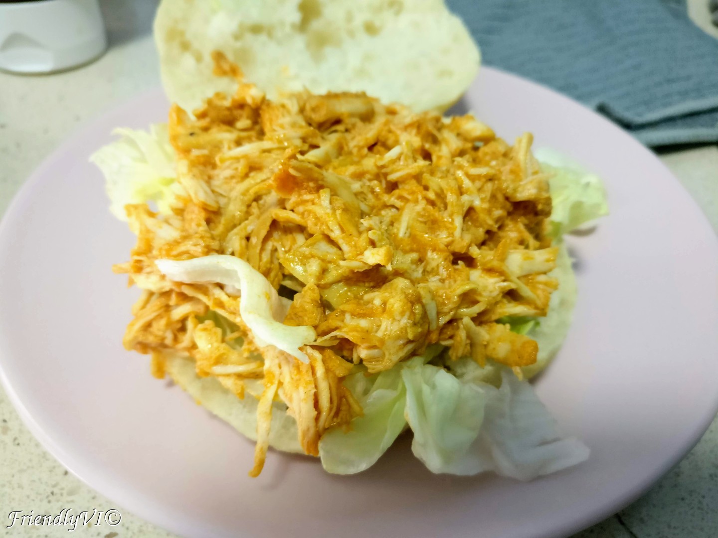 This pulled chicken sandwich with blue cheese is from the series of recipes with pulled chicken. A recipe that is very easy and cheap to make and that you can have at your disposal for inventing all kind of fast and warm dishes, high in protein.