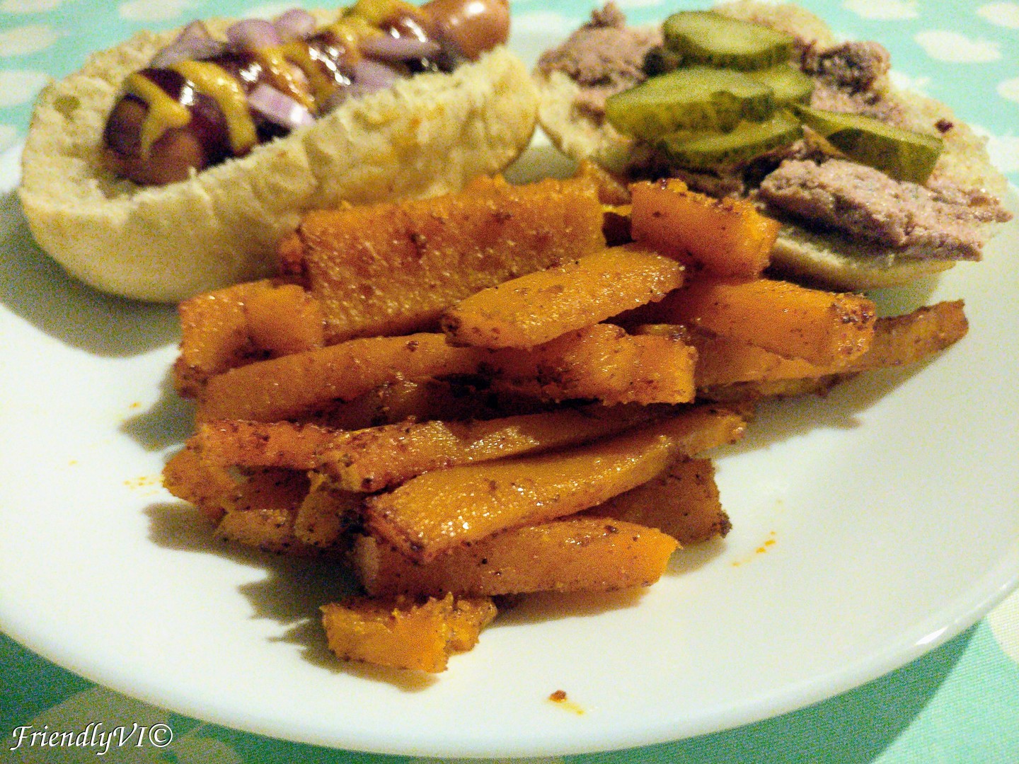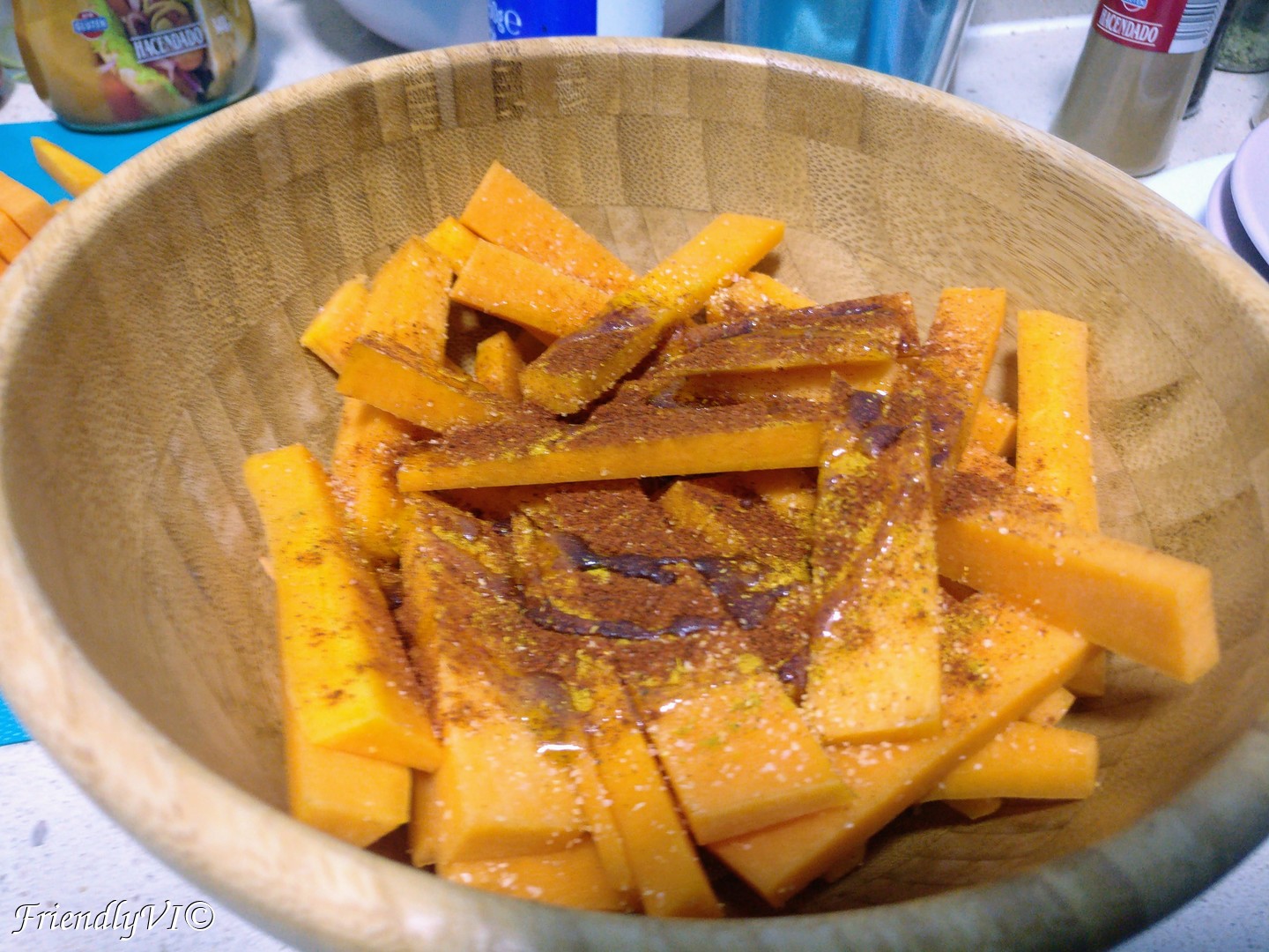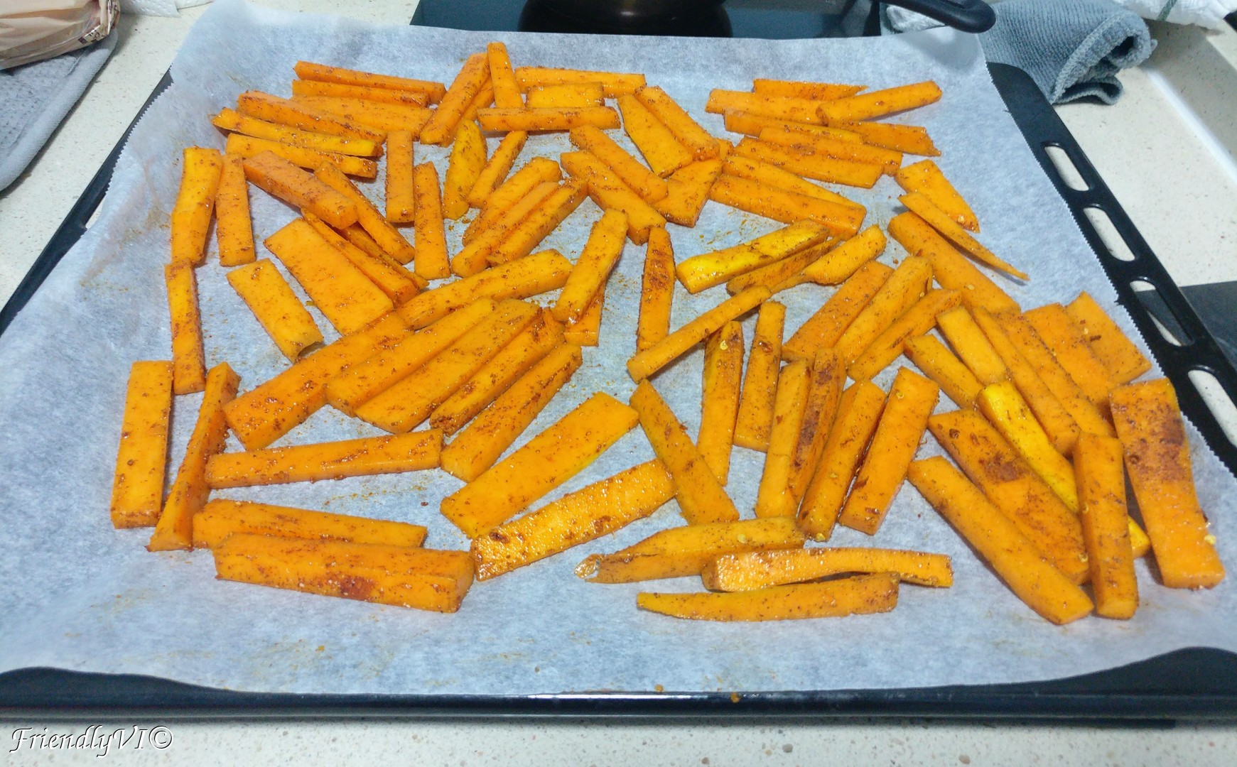 - Cut the pumpkin into fries shape and mix in the salt, paprika, onion, garlic and oil.