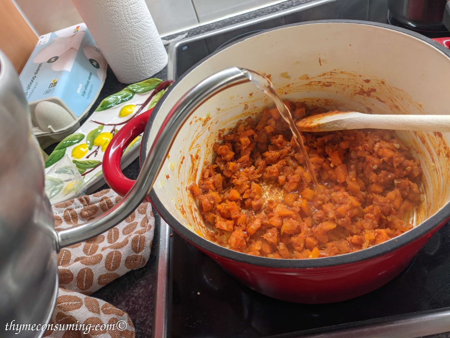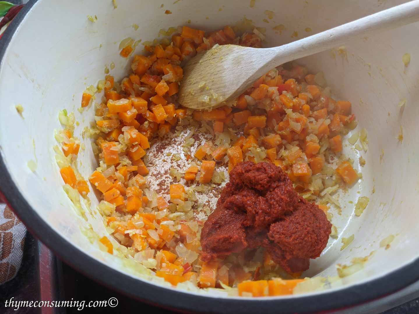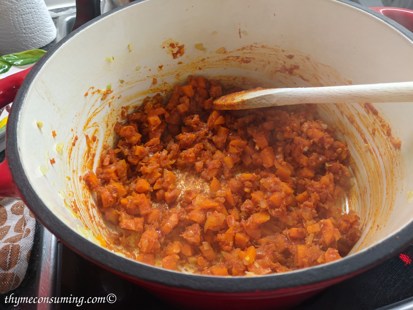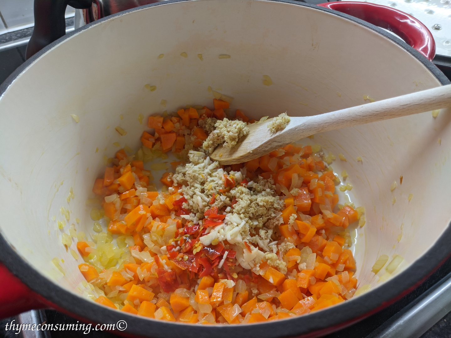 - Add the red Thai curry paste. This is also spicy, so if you can’t handle too much spicy food, skip the fresh chili pepper.