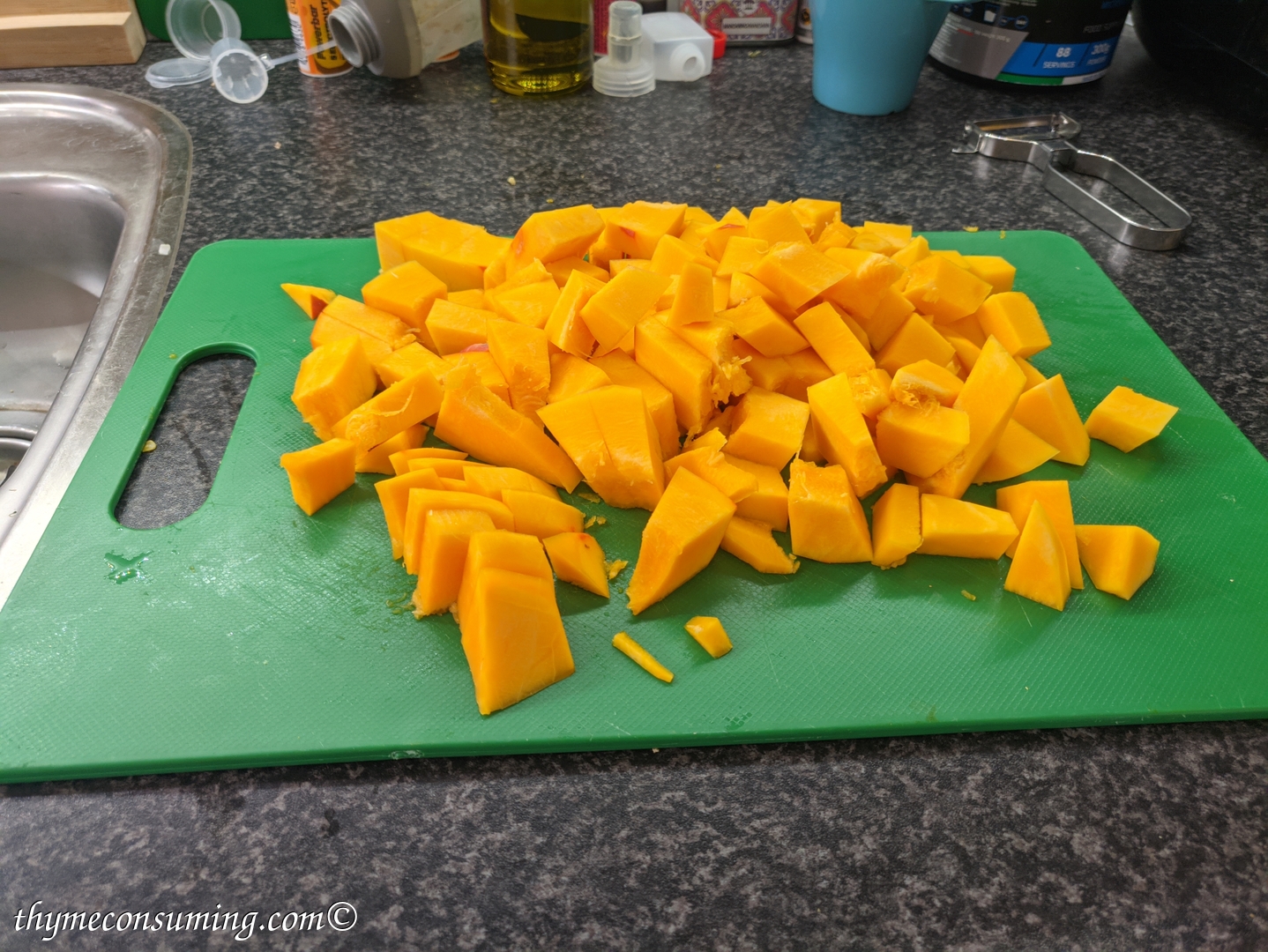 - Carefully cut the pumpkin in two. take out the seeds and peel it off. Cube it into bite sizes.