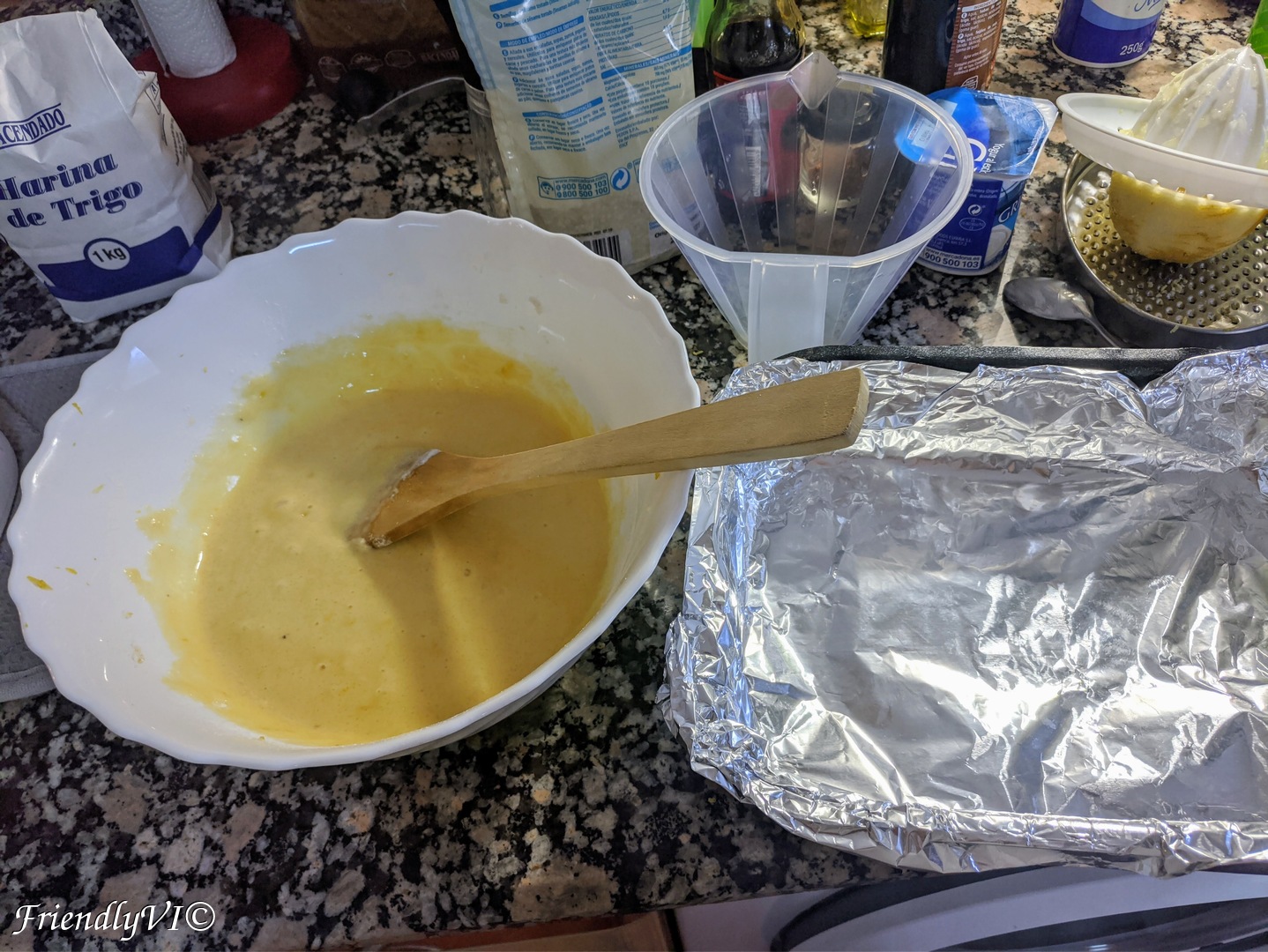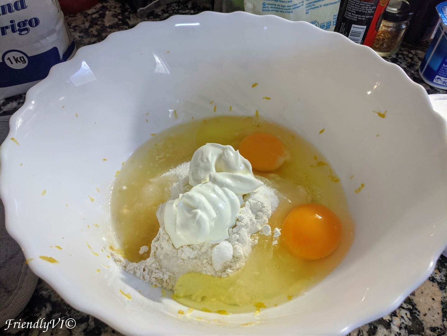- In one bowl add all the ingredients: flour, sugar, oil, salt, baking soda, eggs, yogurt, lemon peel and juice.