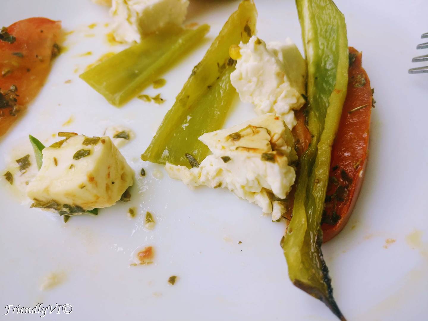 4. Place on the top the rest of tomatoes and pepper and sprinkle more oregano and olive oil. Do not add any salt, since the cheese probably has enough!!!