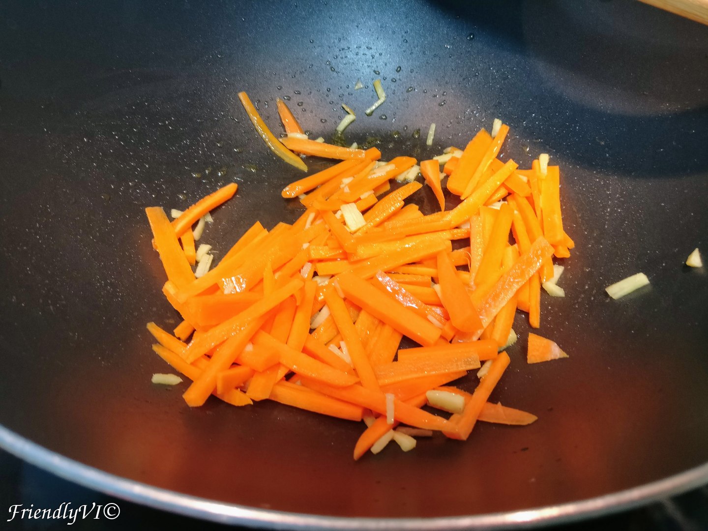 - In a big wok start cooking the ginger with the carrots in a bit of oil.