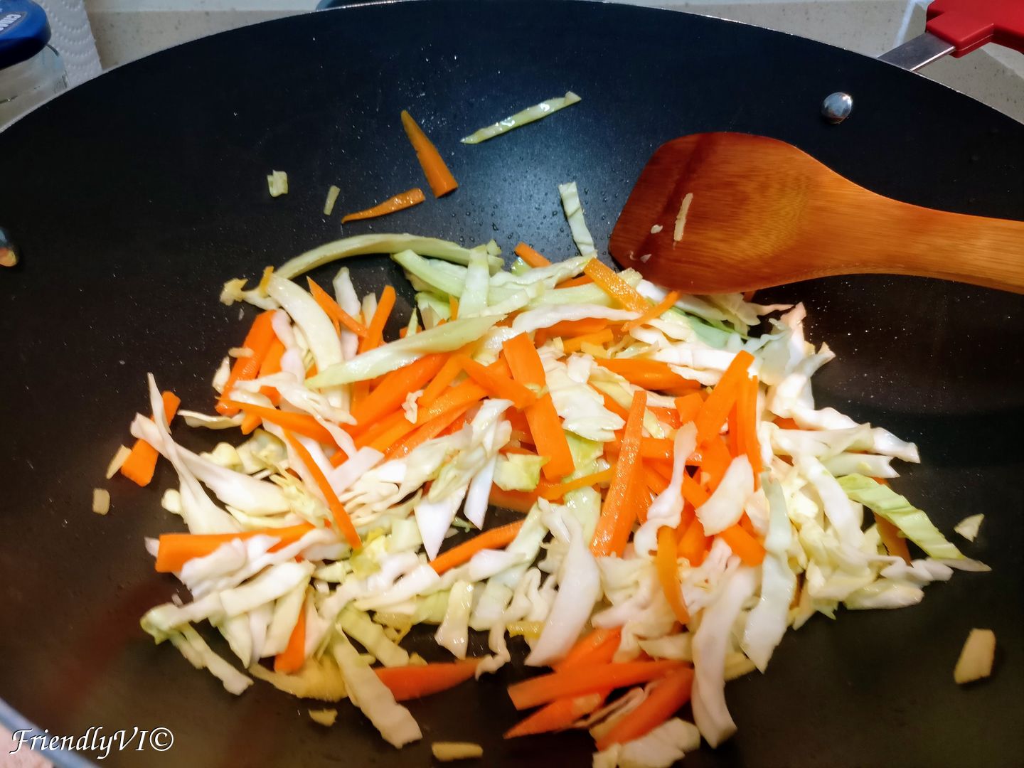 - Once the carrots are a bit cooked (around 4min) start adding the rest of veggies. I opted in this version for cabbage, peas and enoki mushrooms and, towards the end, beans sprouts.