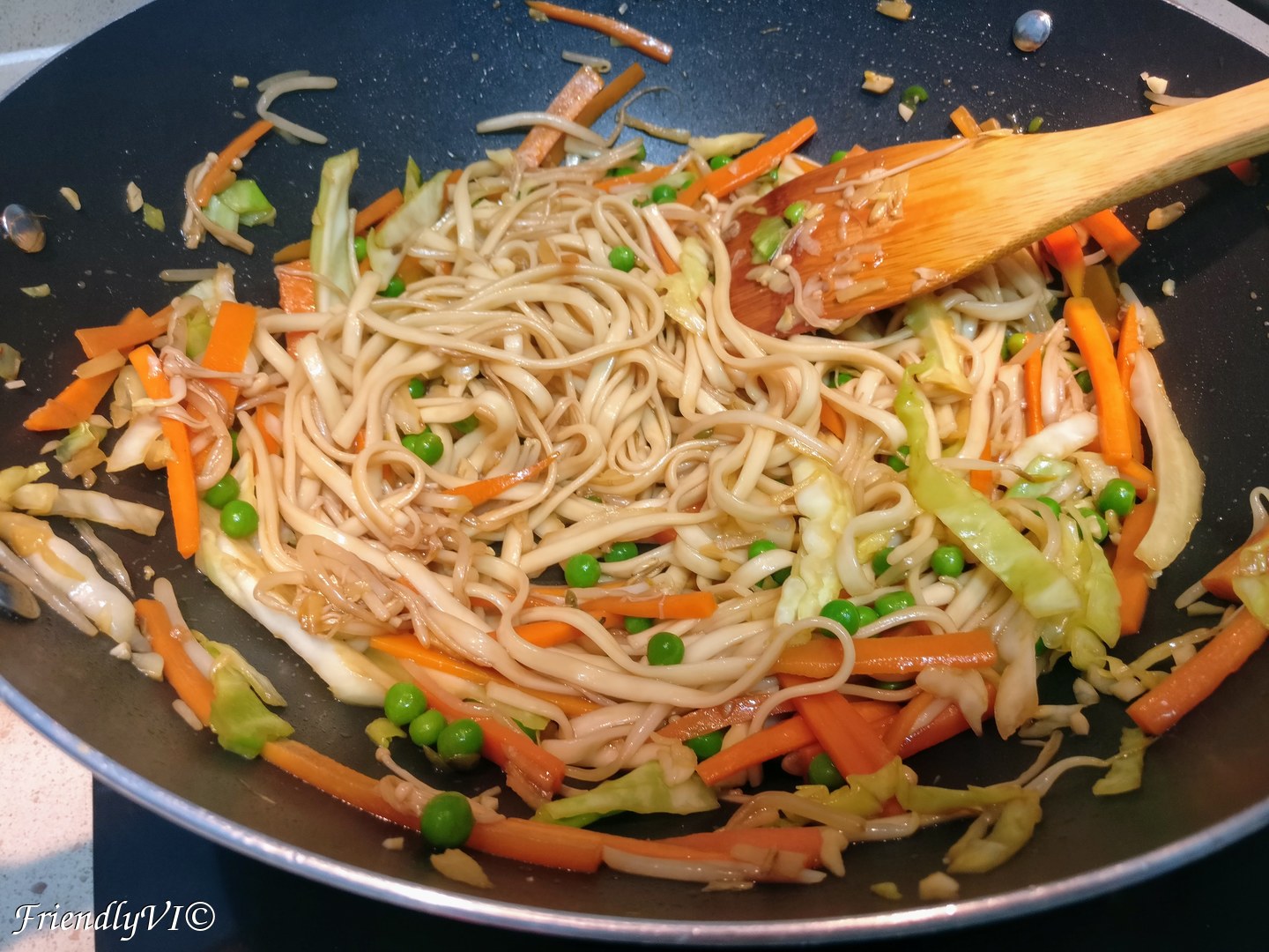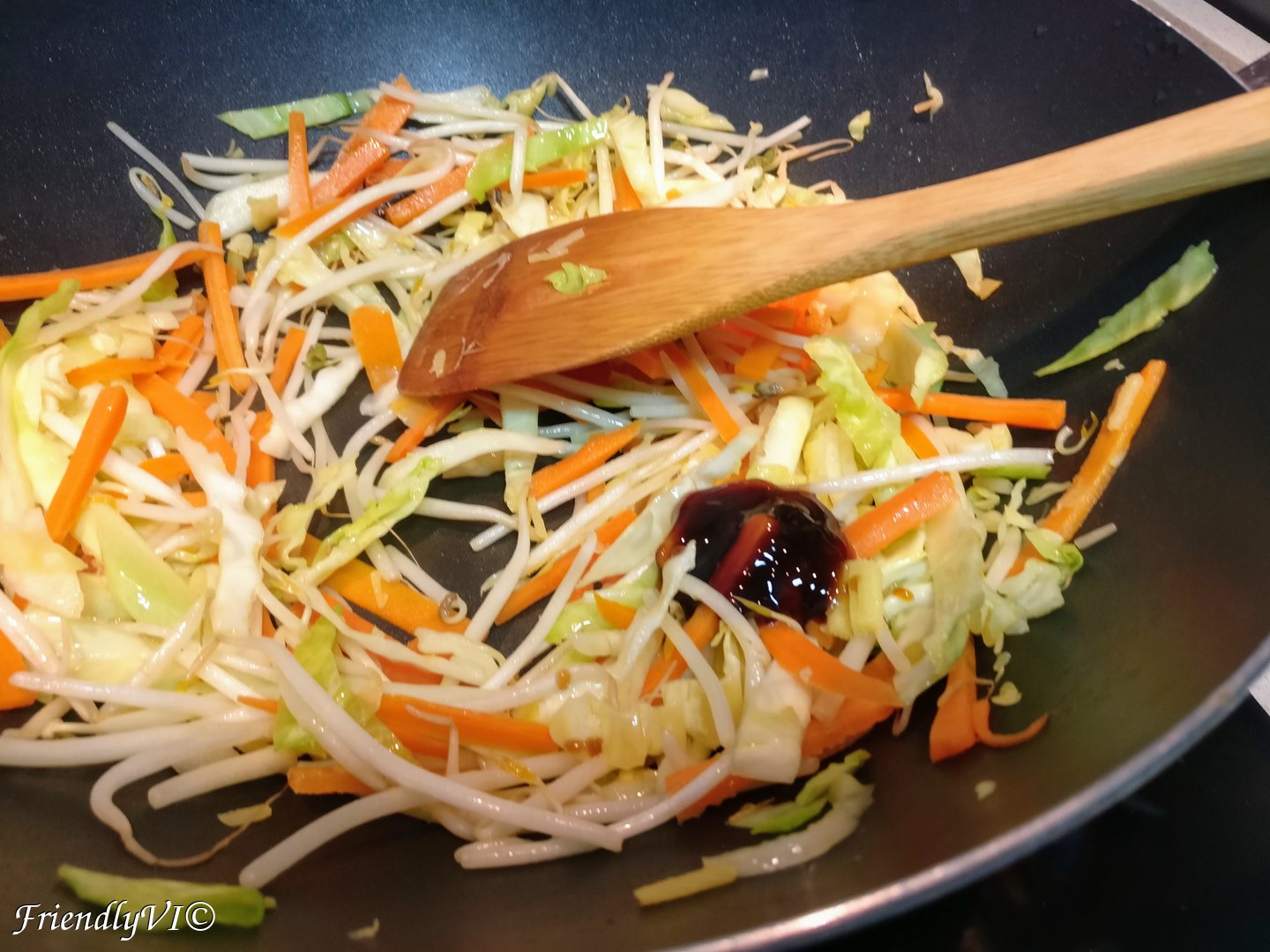- Once the veggies look cooked (not mushy), add the noodles and the soy sauce and let them cook for max 2 min.