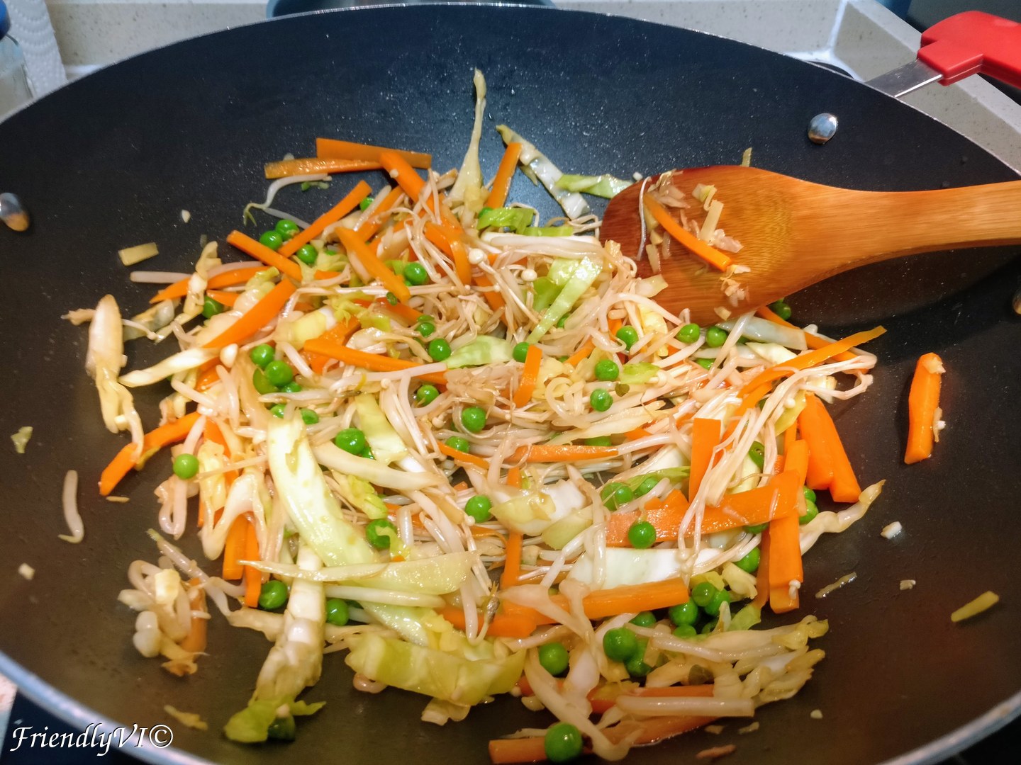 - veggies: carrots, peppers, mushrooms, cabbage, peas, green beans, asparagus, bean sprouts