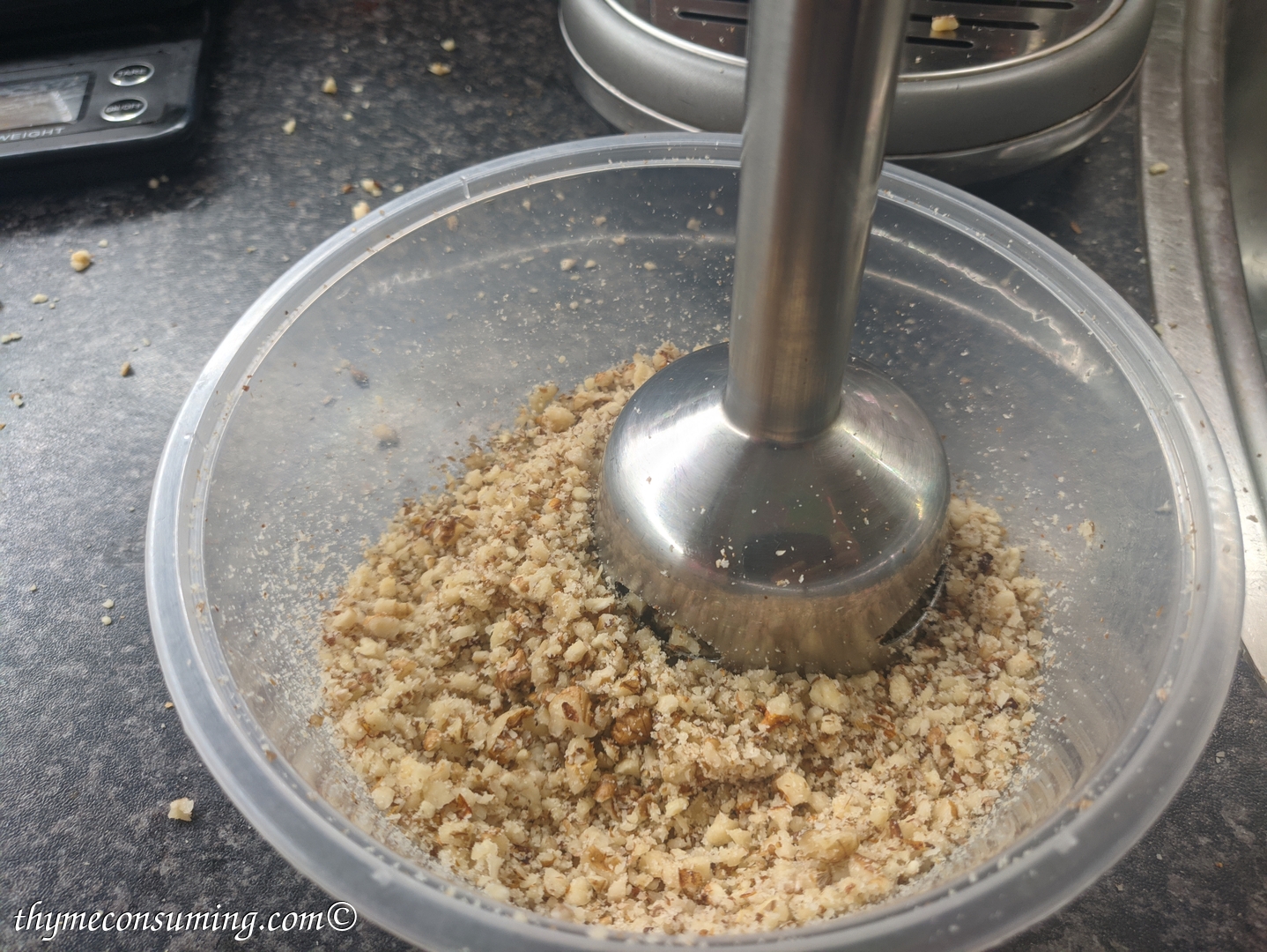 - First thing: I am not sure what machines people have home to grind walnuts, but I don’t have any. So I use my blender to do that and it works just fine… though some walnuts will fly in your kitchen, so I use a paper towel to cover the recipient in which I blend.