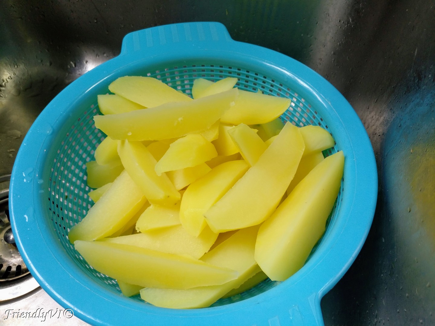 - While the stew is simmering and the potatoes are probably ready, let them cool down in a strainer so that the vapors go out of them.