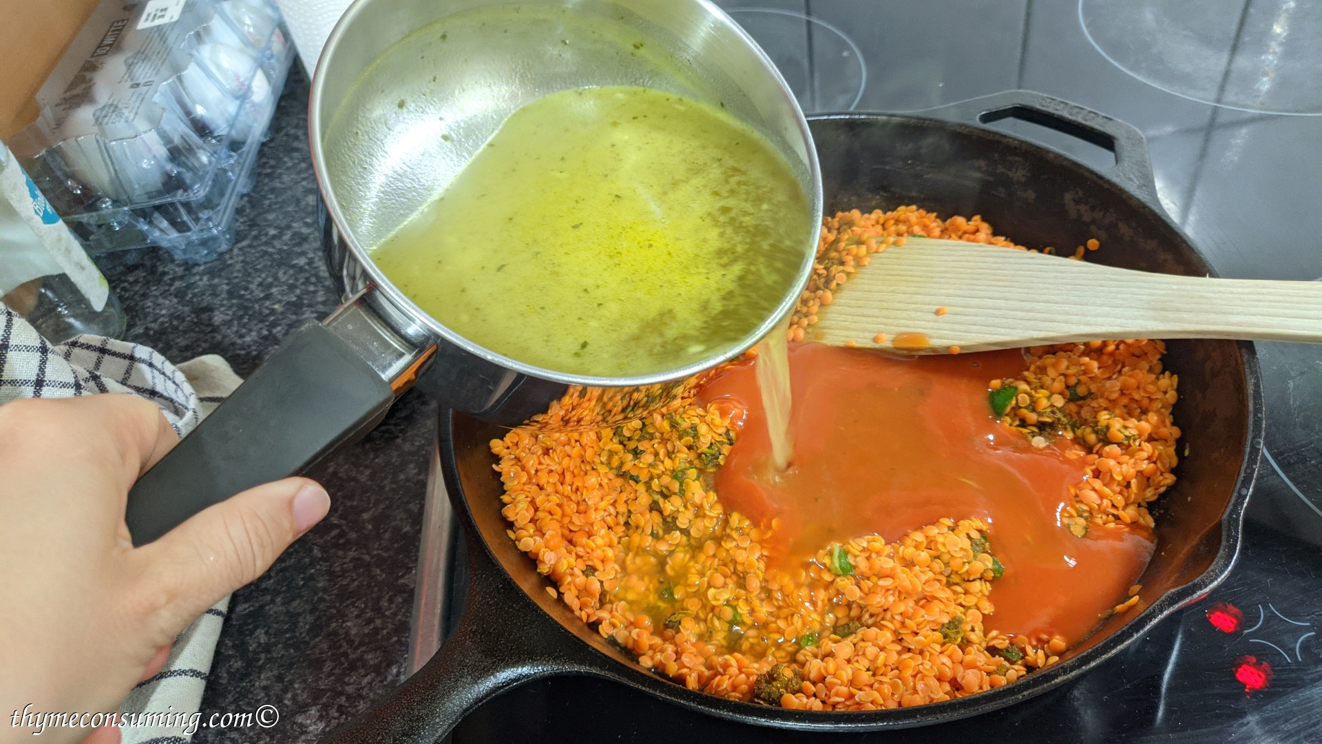- You can now pour in the broth, lentils and tomato paste and simmer for 20 min.