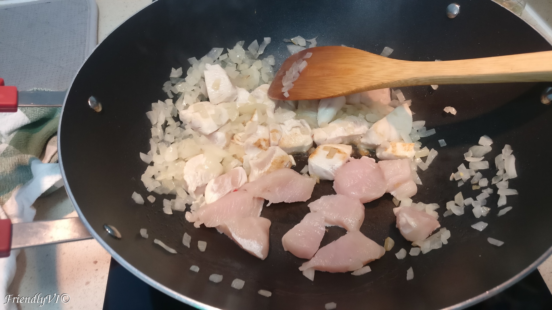 - In a hot wok, fry the diced onion in the coconut oil until it gets golden.