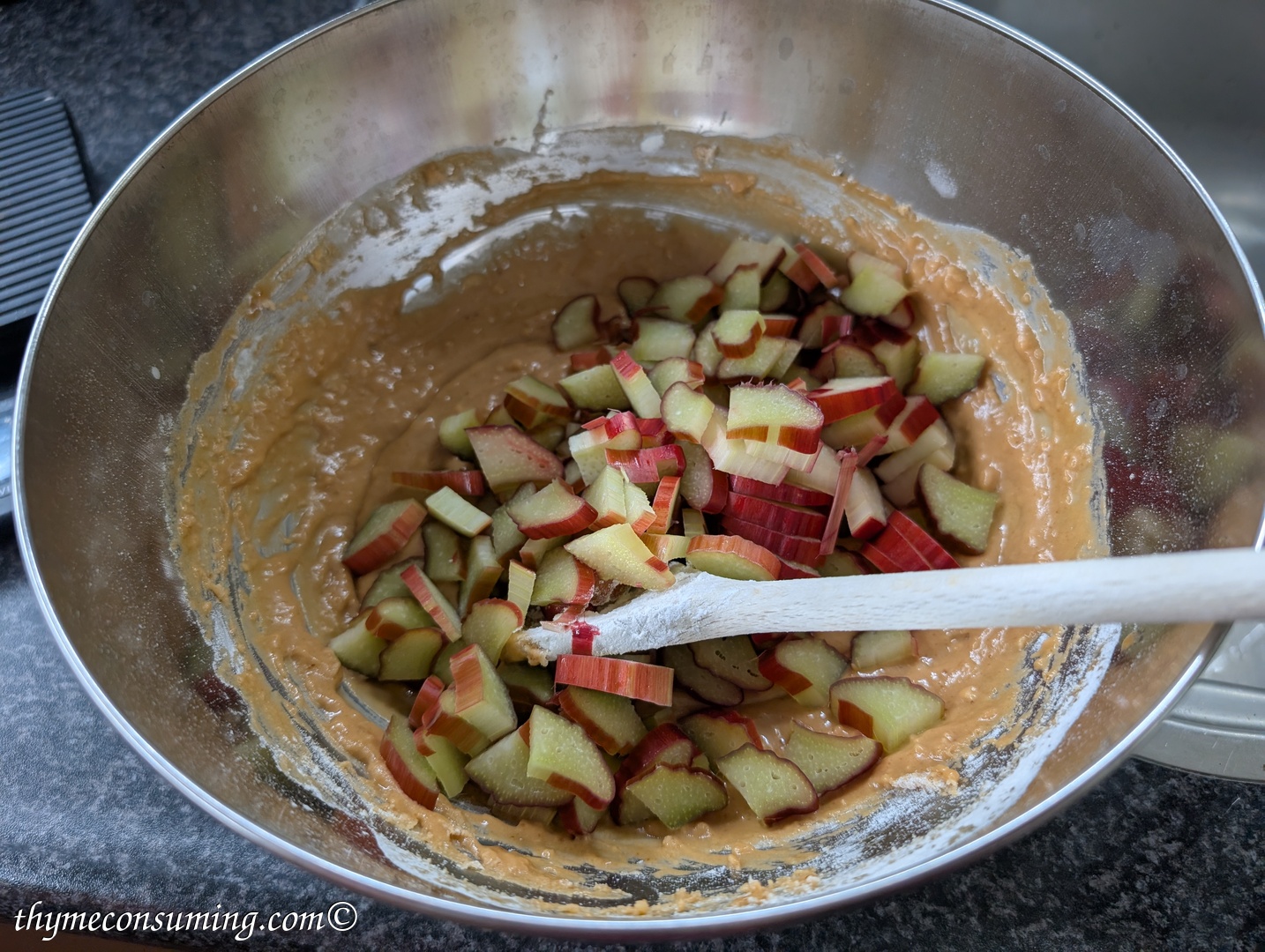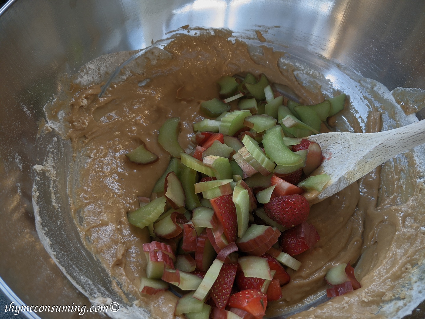 - Add the chopped 2 stalks of rhubarb. Optionally, you can add strawberries for extra fruitiness. Keeping with rhubarb only is very delicious already, though.