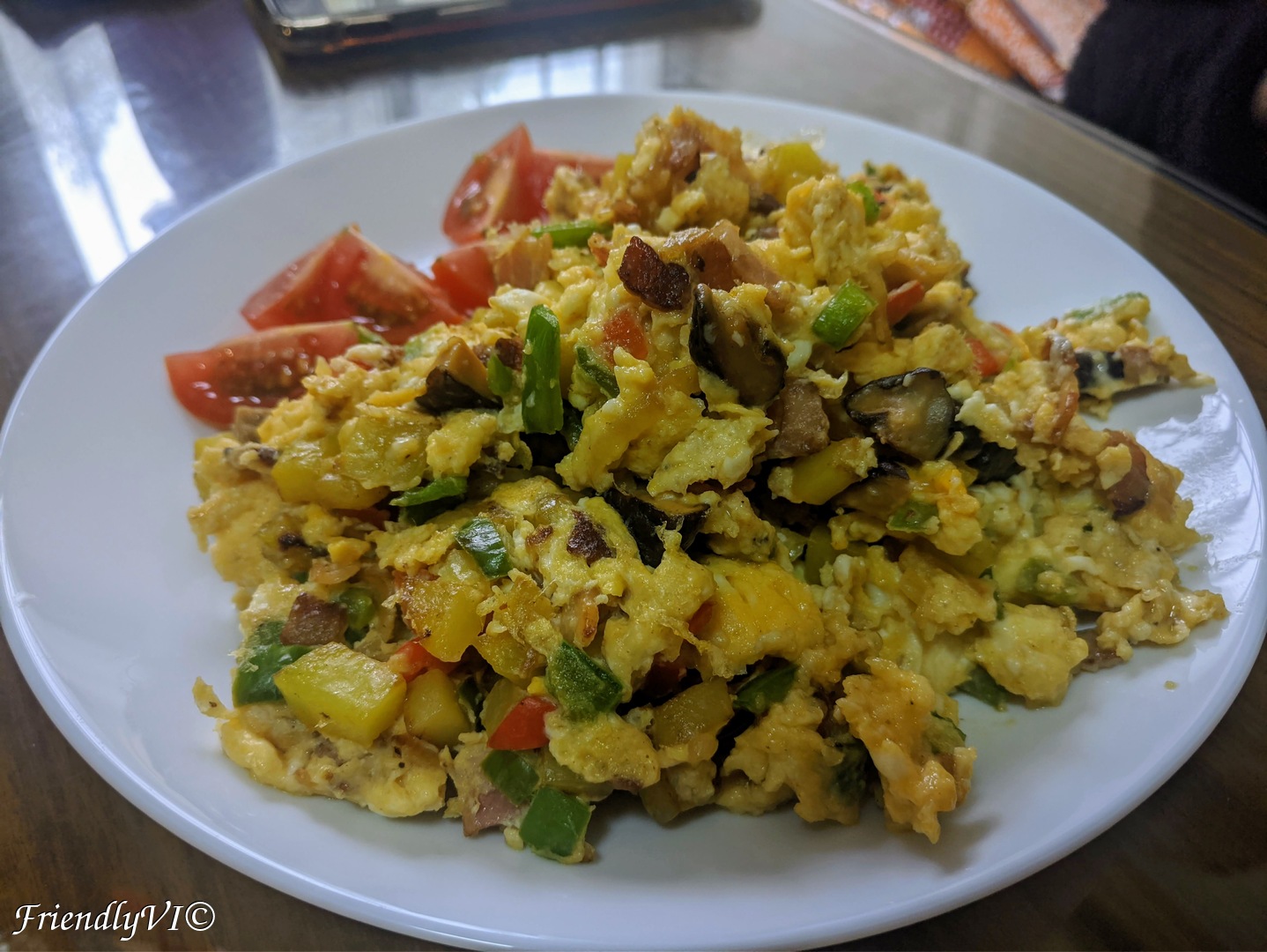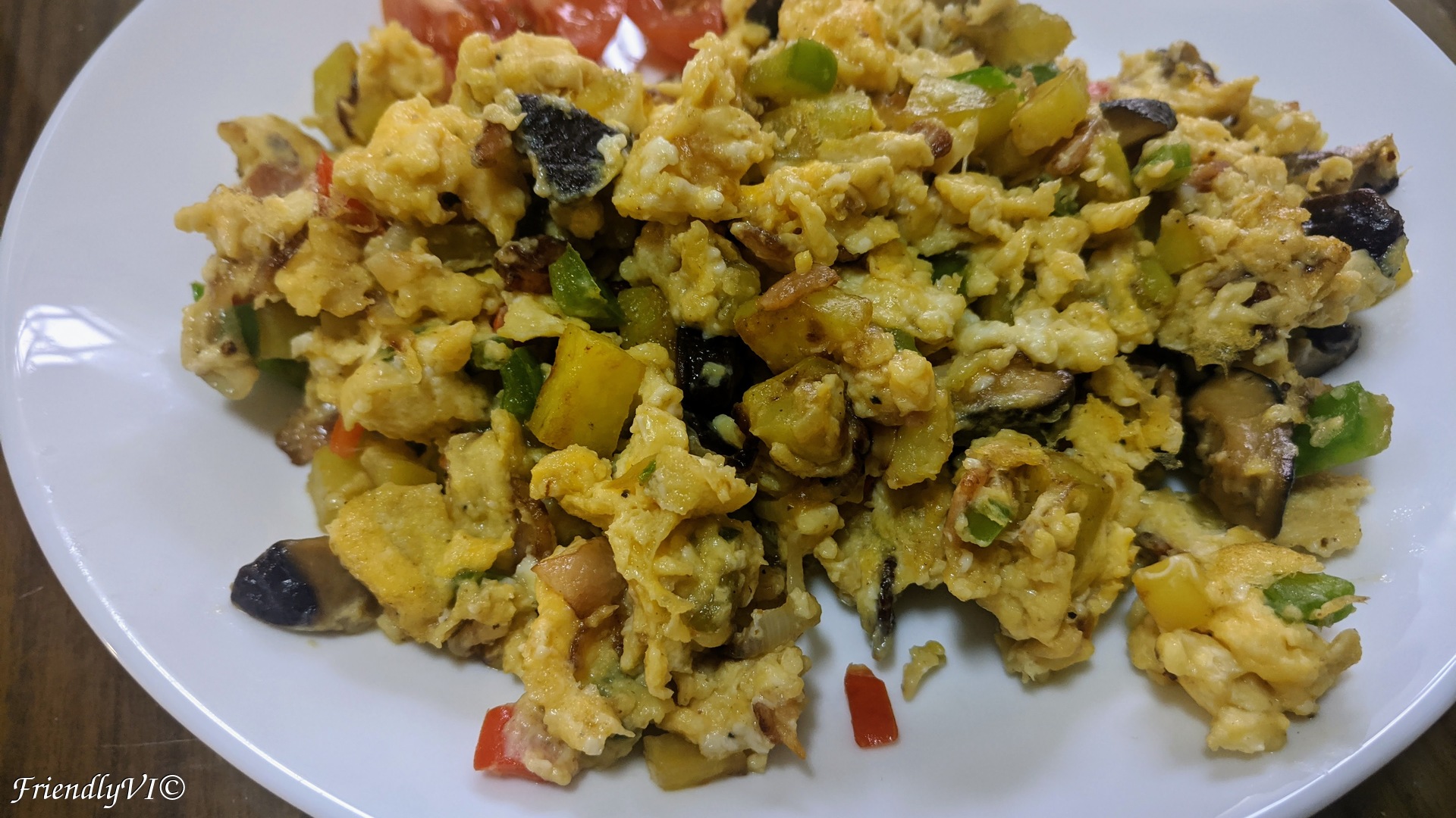 These scrambled eggs are a perfect way to start the day. Usually I feel like having a piece of bread next to any type of scrambled eggs. But this version contains potatoes, therefore it is perfect to eat without bread and it is even gluten free. It is full of umami taste and colorful. Here is how to make it.