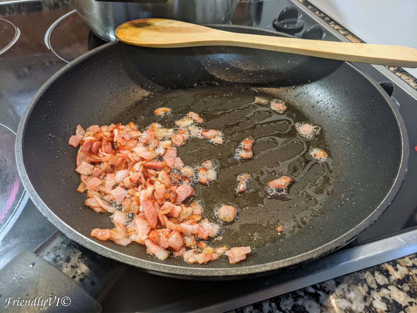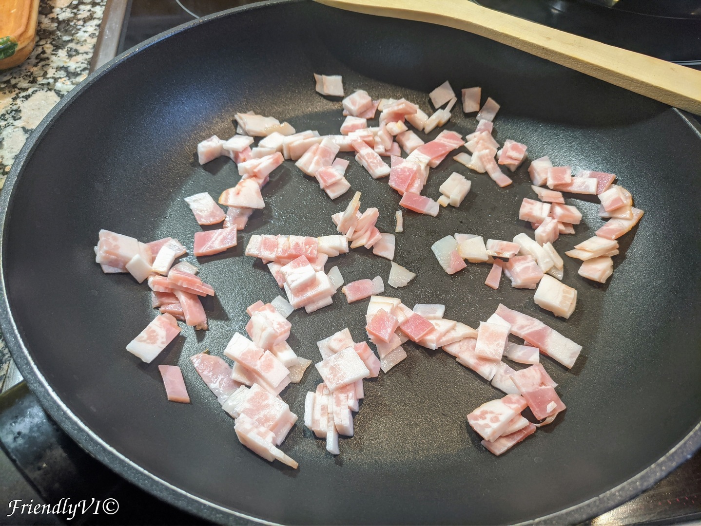 - First, start cooking the diced bacon. It is best to cook it first so that you can use the fat from it for cooking the rest. Put it aside.