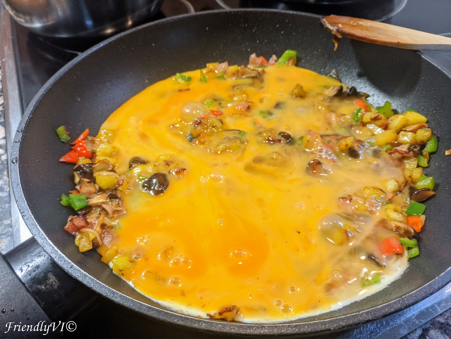 - It’s time to add the mixed eggs, seasoned with salt and pepper.