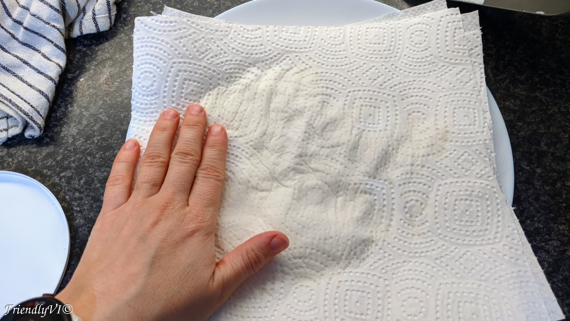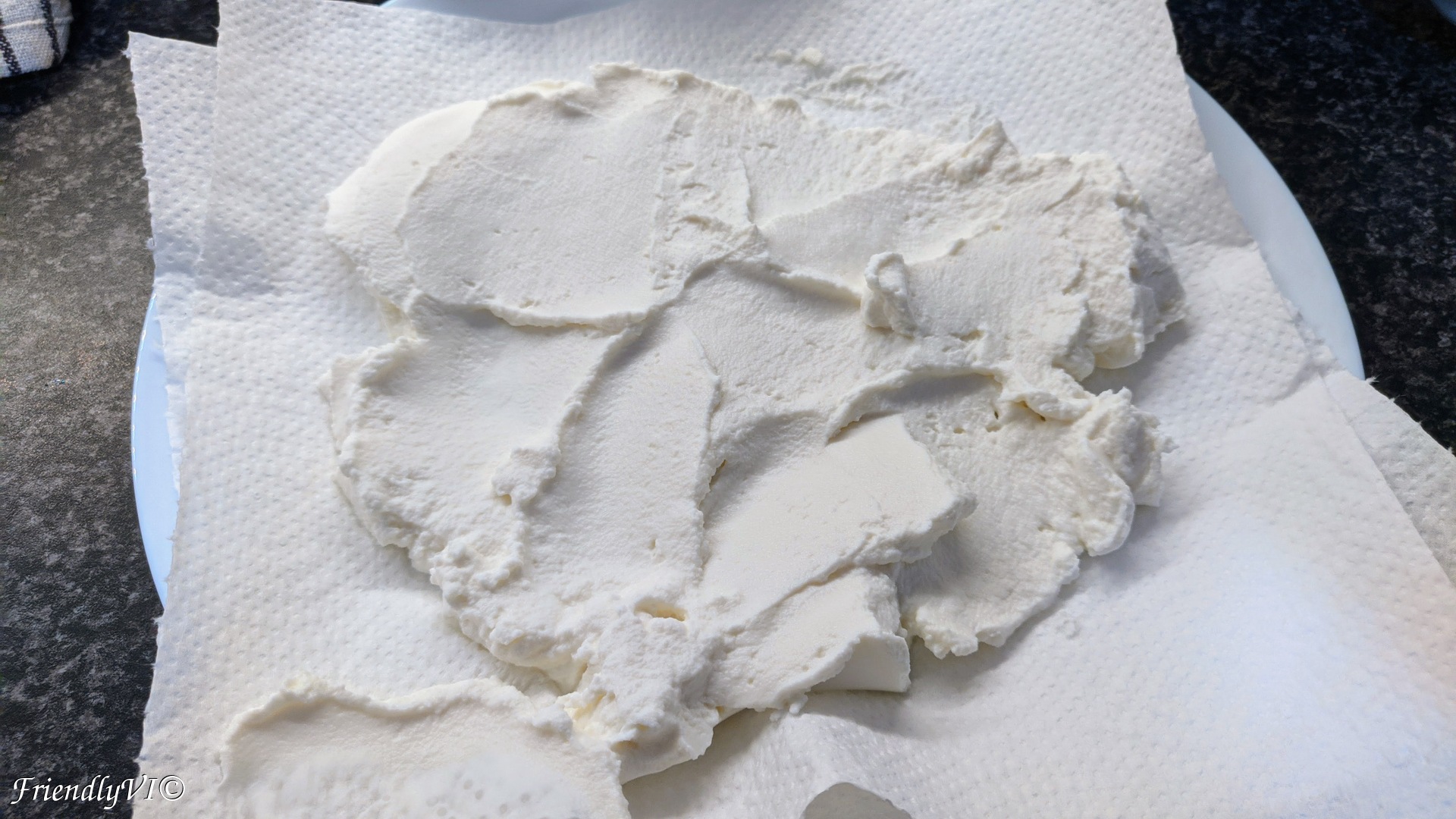 1. Place the ricotta on paper towels and add more on top of it to remove as much moisture as you can.