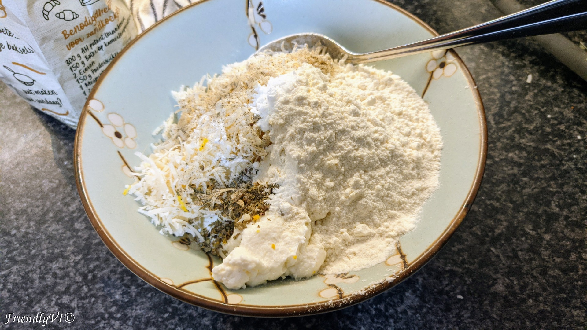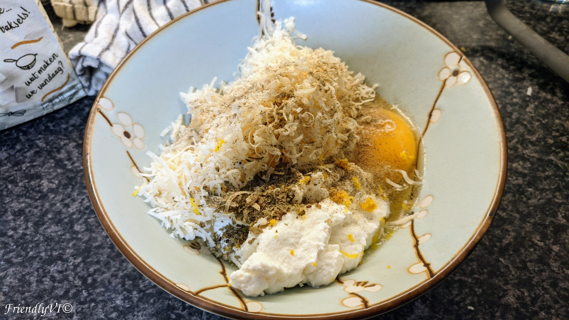 2. In a bowl, add the dried ricotta, egg, grated parmezan, basil, lemon zest, salt pepper and flour and mix well.