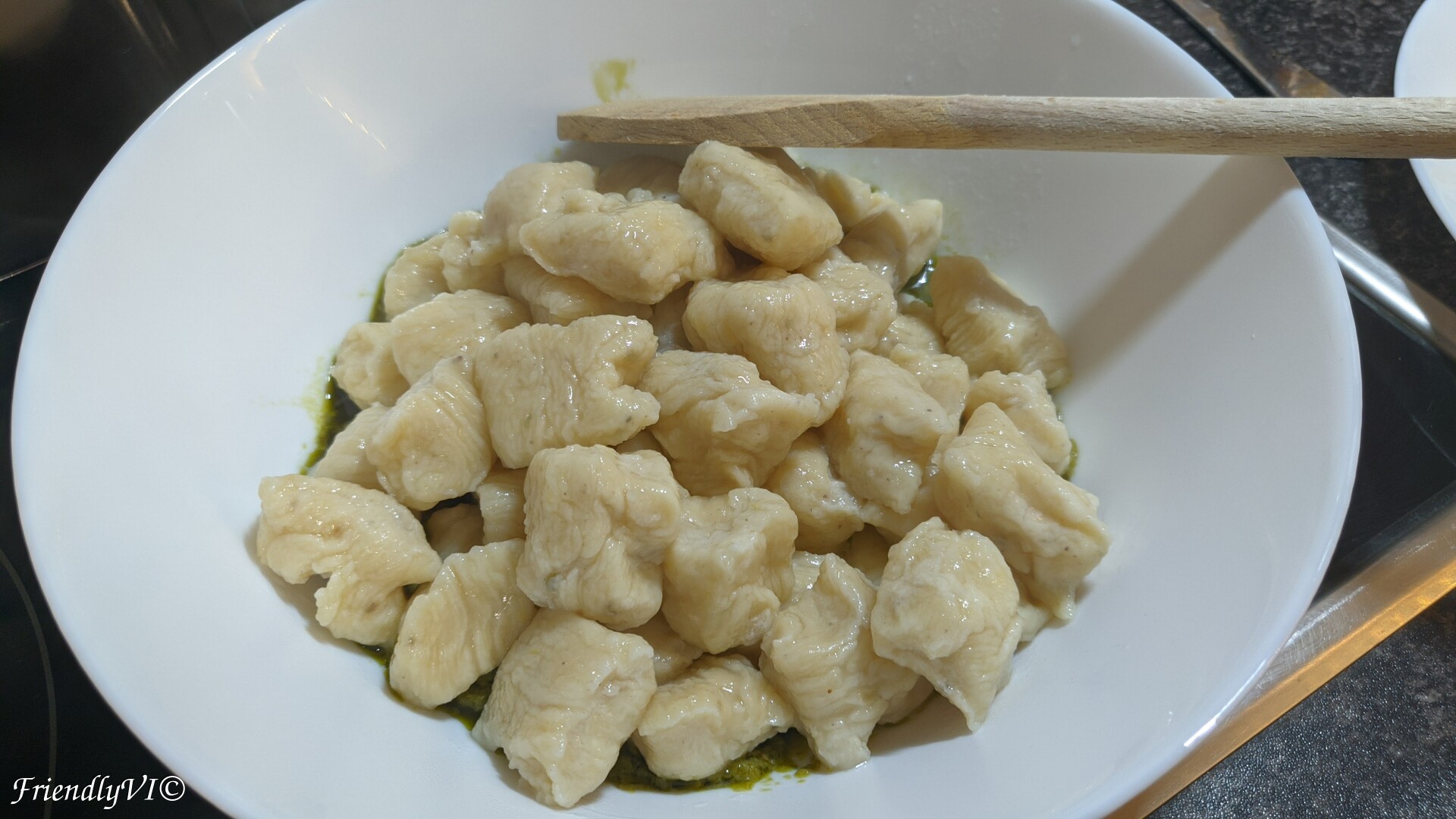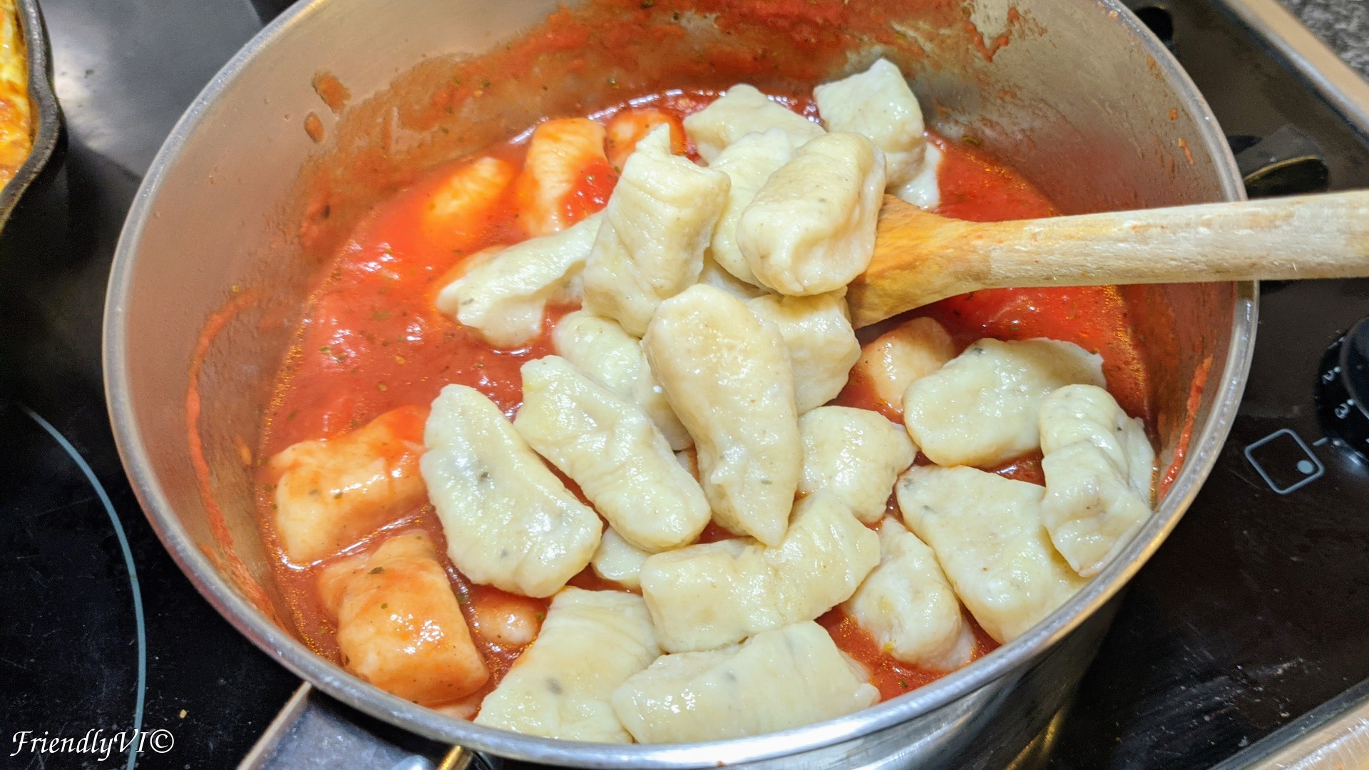 9. Add the gnocchi with a strainer to the tomato pot, add oregano, basil and olive oil and mix gently. For the pesto version, just add the gnocchi to the pesto (I use store bought version), add a bit of extra hot water and that is all.