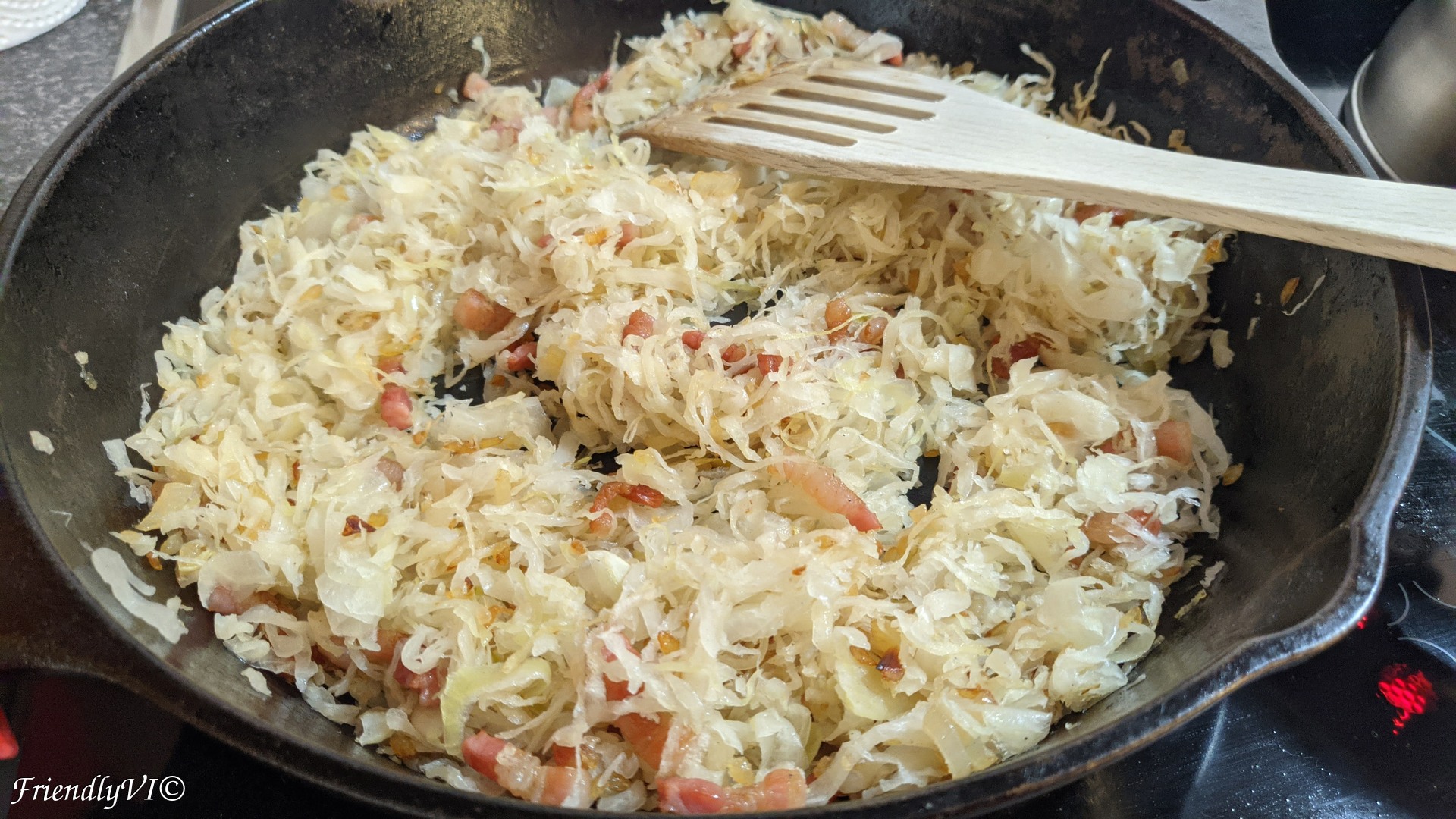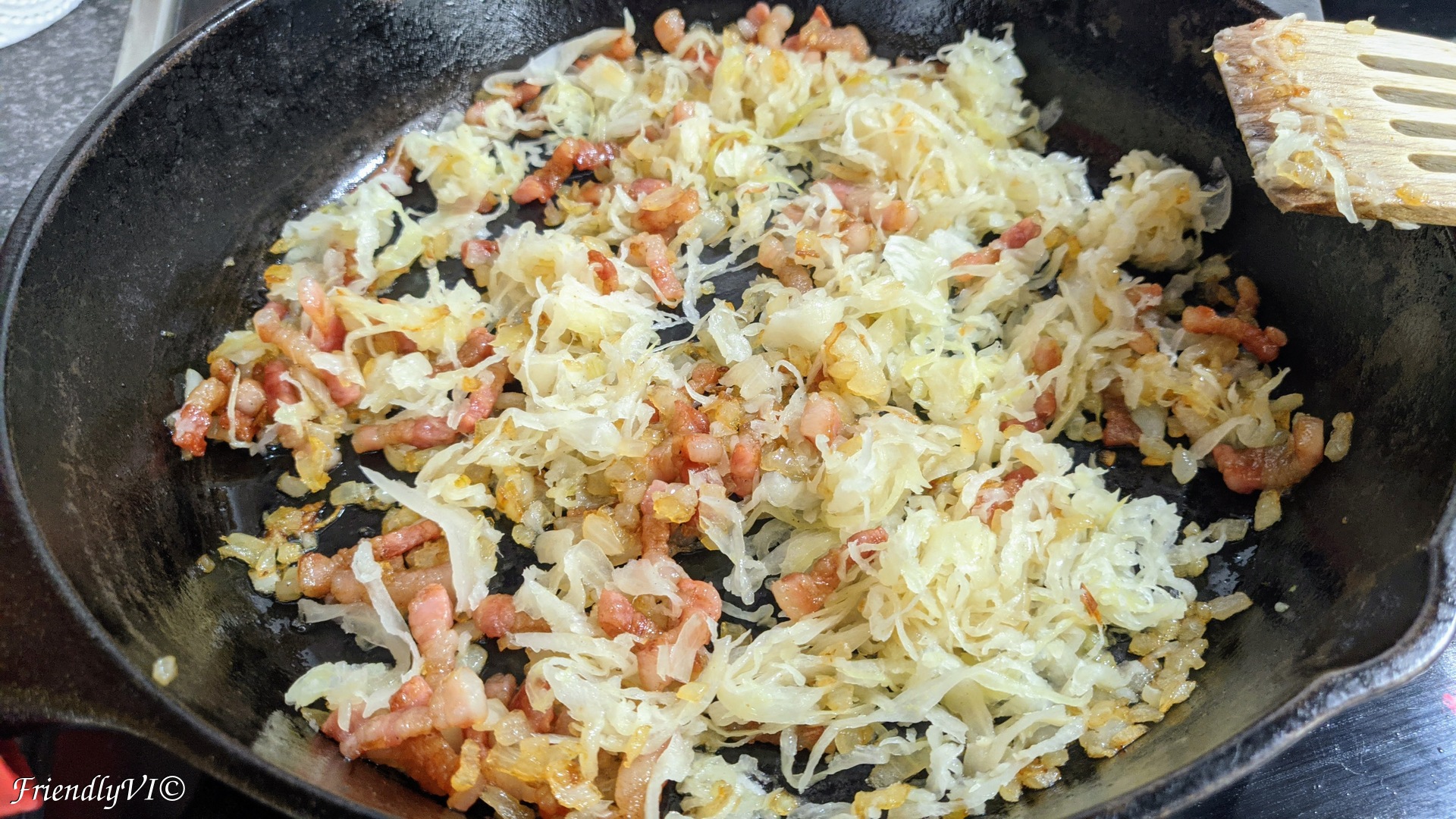 - In the meantime, squeeze as much liquid as you can from the sauerkraut. This will help the sauteing to be faster, since there is less liquid you have to evaporate.