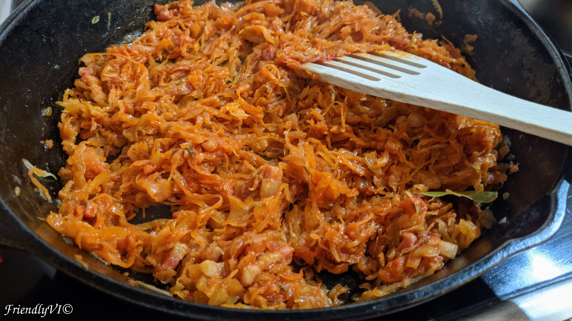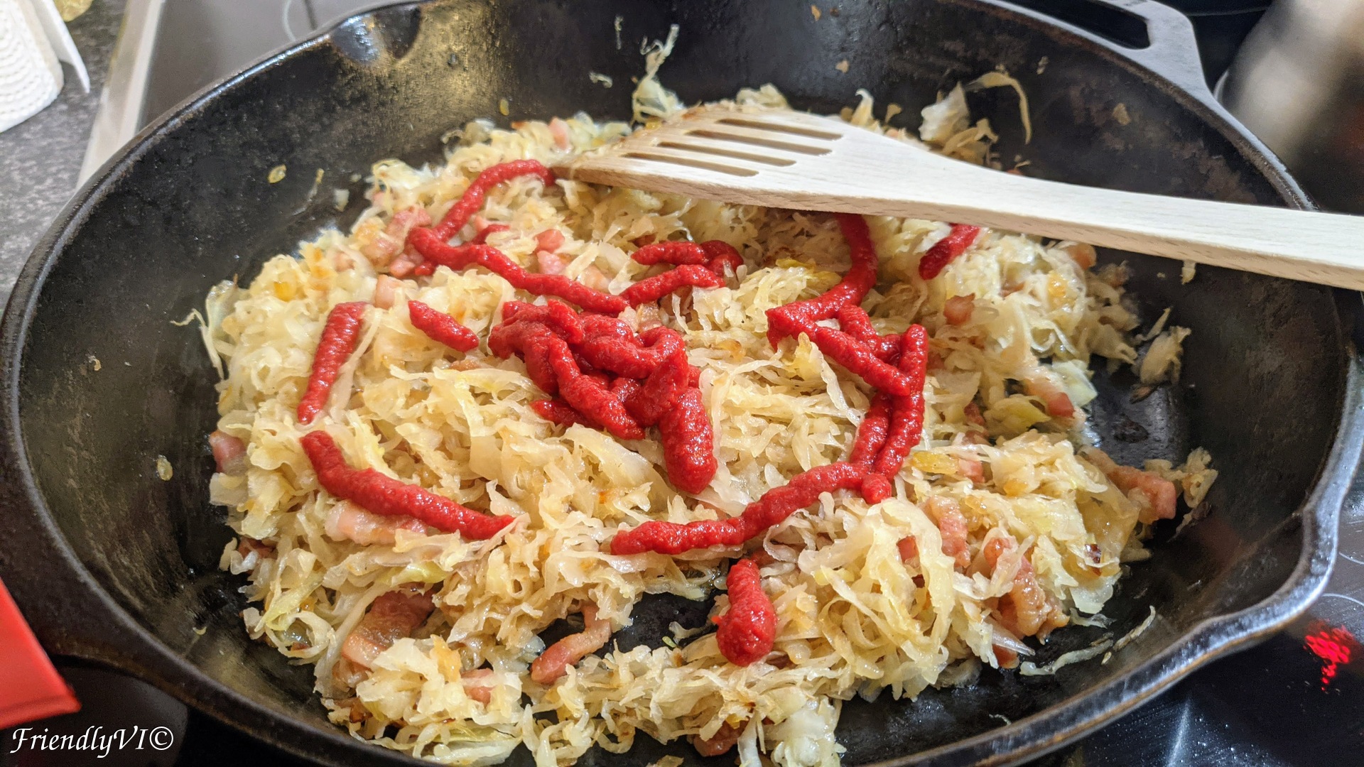 Varza calita, translated as stewed or sauteed sauerkraut is a very traditional Romanian dish. It can be served both as main meal or as side dish. And it is a bomb of umami: it contains sauerkraut which is already packed with umami, bacon and sweet tomato paste.
